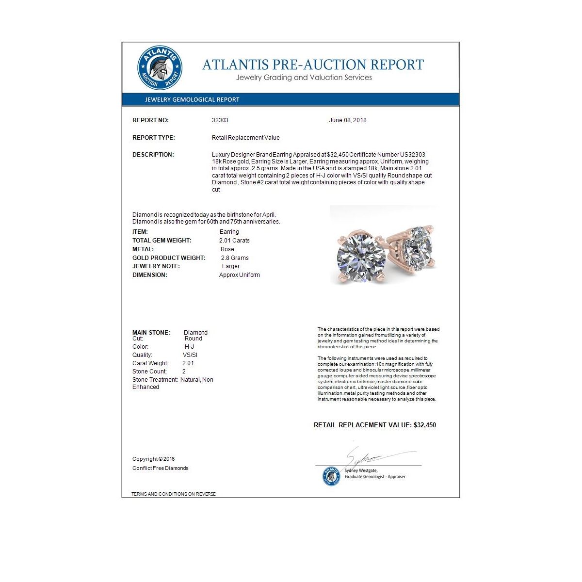 REF-540W6F -32303 ---- 2.01 CTW VS/SI Diamond Stud Designer Earrings 18K Rose Gold ---- Luxury Designer Brand Earring Appraised at $32,450 Certificate Number US32303 18k Rose gold, Earring Size is Larger, Earring measuring approx. Uniform, weighing in total approx. 2.5 grams. Made in the USA and is stamped 18k, Main stone 2.01 carat total weight containing 2 pieces of H-J color with VS/SI quality Round shape cut Diamond , Stone #2 carat total weight containing pieces of color with quality shape cut