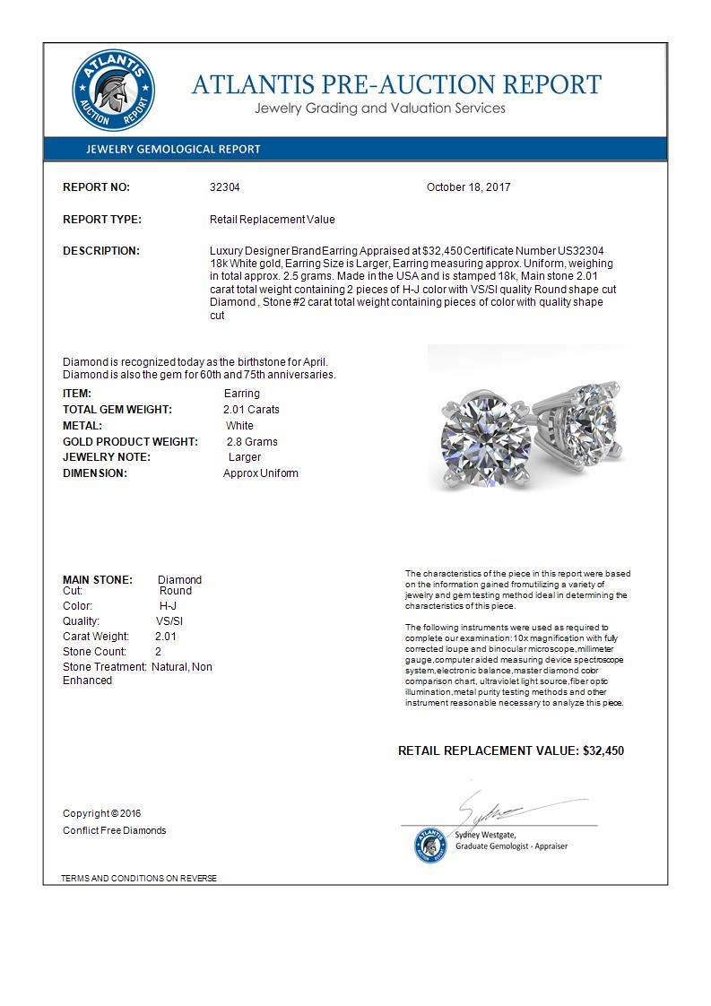 REF-540T6M -32304 ---- 2.01 CTW VS/SI Diamond Stud Designer Earrings 18K White Gold ---- Luxury Designer Brand Earring Appraised at $32,450 Certificate Number US32304 18k White gold, Earring Size is Larger, Earring measuring approx. Uniform, weighing in total approx. 2.5 grams. Made in the USA and is stamped 18k, Main stone 2.01 carat total weight containing 2 pieces of H-J color with VS/SI quality Round shape cut Diamond , Stone #2 carat total weight containing pieces of color with quality shape cut