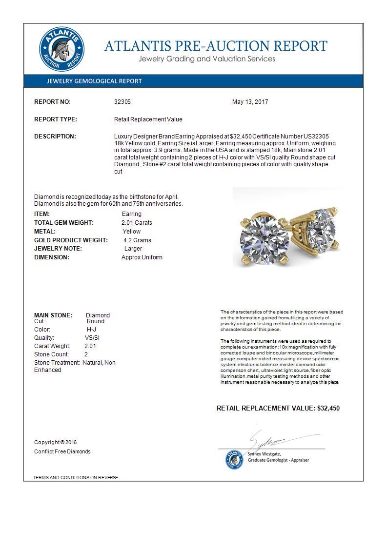 2.01 CTW VS/SI Diamond Stud Designer Earrings 18K Yellow Gold ---- Luxury Designer Brand Earring Appraised Retail Price at $32,450 ---- SKU Number US32305 18k Yellow gold Earring Size is Larger, Earring measuring approx. Uniform, weighing in total approx. 3.9 grams. Made in the USA and is stamped 18k, Main stone 2.01 carat total weight containing 2 pieces of H-J color with VS/SI quality Round shape cut Diamond , Stone #2 carat total weight containing pieces of color with quality shape cut