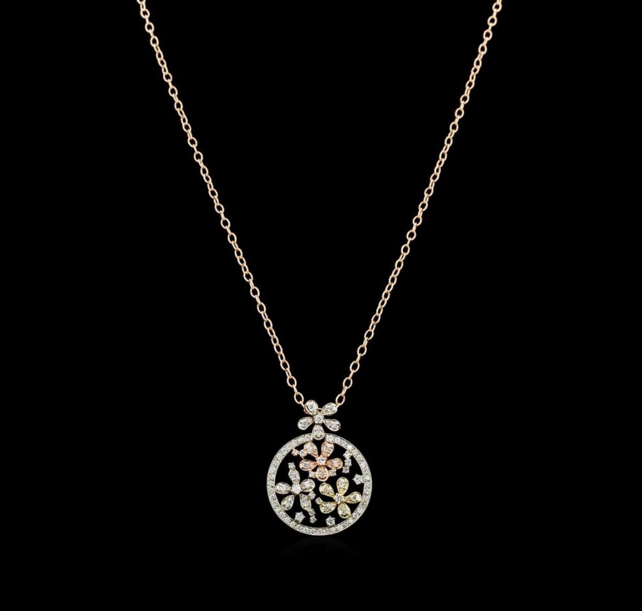 One electronically tested 14KT yellow, white, and rose gold lady's combination cast & assembled fashion pendant & chain 18.0" long, 2.7mm textured cable link with a lobster claw clasp with a bright polish finish. Identified with markings of "K14". Condition is new, good workmanship. Containing: Seven prong set round brilliant cut diamonds, measuring 2.20 - 2.10 x 1.40mm (depth est.) approximate total weight of 7 Stones = 0.28ct. Graded in the setting. Clarity: SI-2 to I-1. Color: H - I. Cut Good Seventy-Three prong set round brilliant cut diamonds, measuring 2.00 - 1.60 x 1.08mm (depth est.) approximate total weight of 73 Stones = 1.58ct. Graded in the setting. Clarity: SI-2 to I-1. Color: H - I. Cut Good Twenty prong set round brilliant cut diamonds, measuring 1.30 - 1.25 x 0.77mm (depth est.) approximate total weight of 20 Stones = 0.15ct. Graded in the setting. Clarity: SI-2 to I-1. Color: H - I. Cut Good. Total Weight of Diamonds 2.01ct. Total Weight of Pendant & Chain 11.80gm. GAS Appraised.