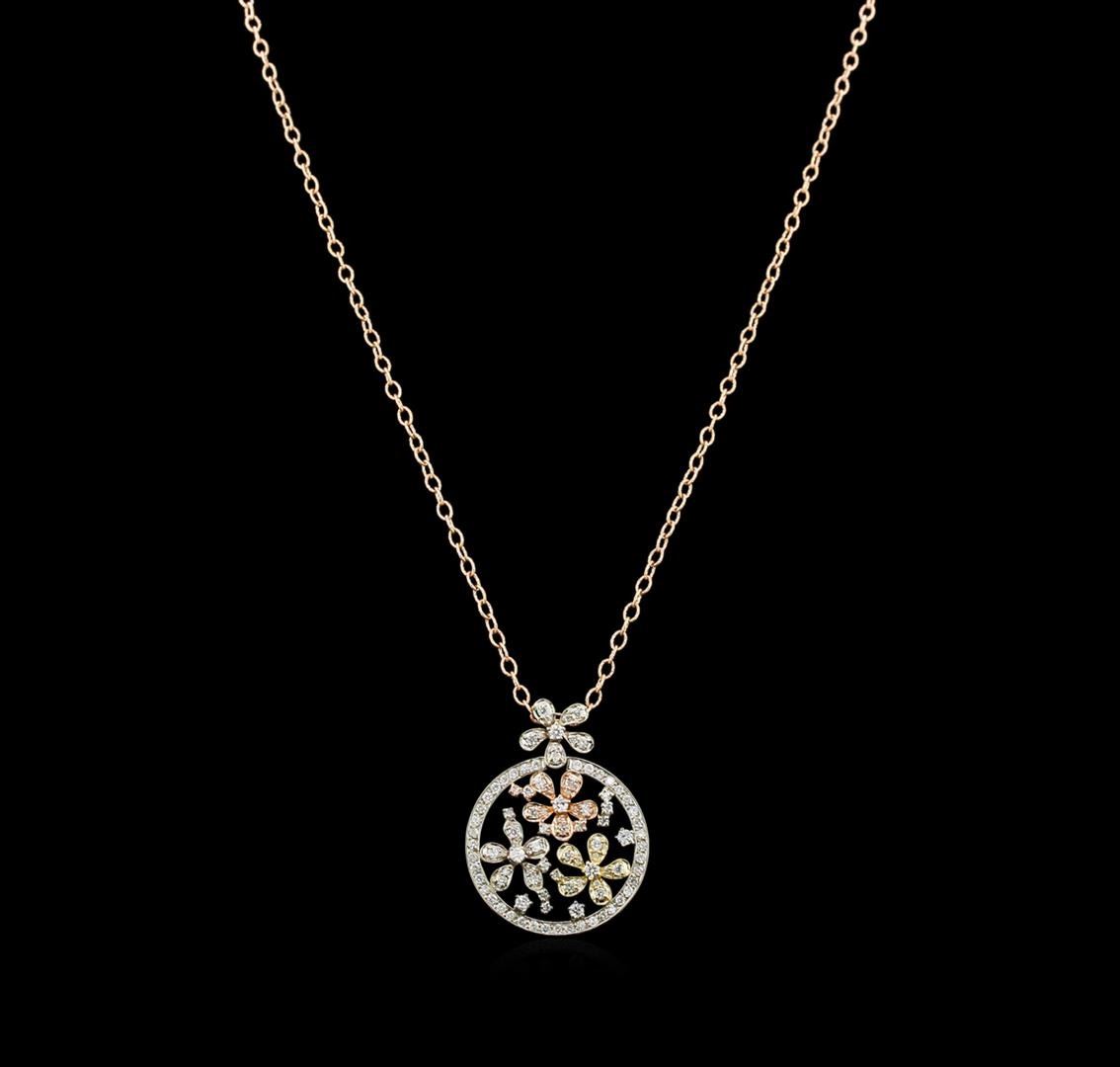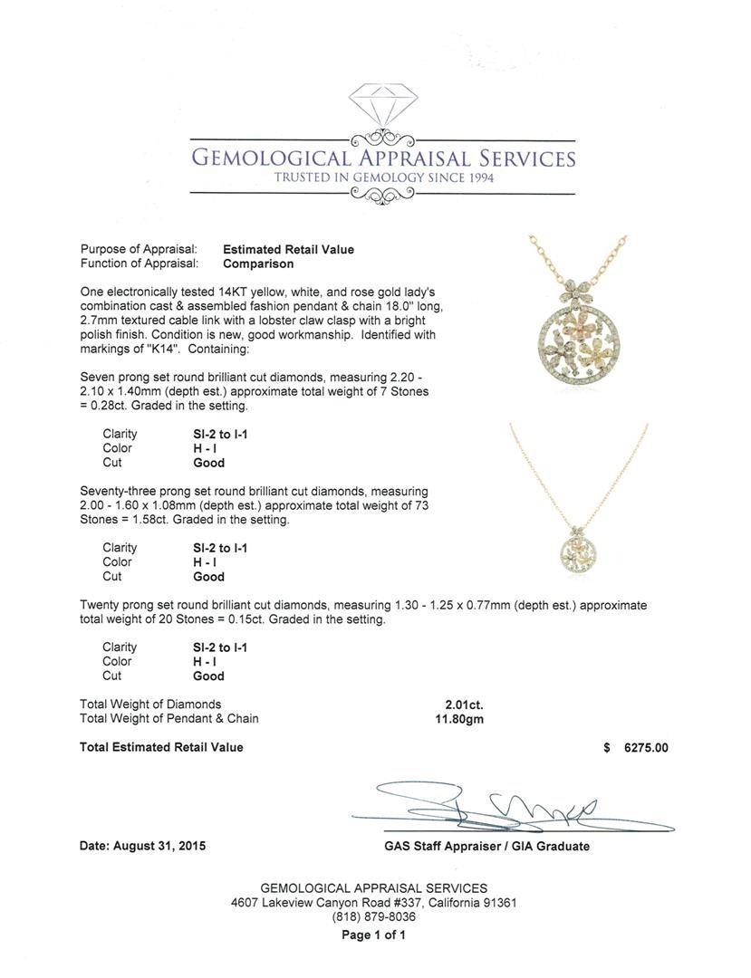 One electronically tested 14KT yellow, white, and rose gold lady's combination cast & assembled fashion pendant & chain 18.0" long, 2.7mm textured cable link with a lobster claw clasp with a bright polish finish. Identified with markings of "K14". Condition is new, good workmanship. Containing: Seven prong set round brilliant cut diamonds, measuring 2.20 - 2.10 x 1.40mm (depth est.) approximate total weight of 7 Stones = 0.28ct. Graded in the setting. Clarity: SI-2 to I-1. Color: H - I. Cut Good Seventy-Three prong set round brilliant cut diamonds, measuring 2.00 - 1.60 x 1.08mm (depth est.) approximate total weight of 73 Stones = 1.58ct. Graded in the setting. Clarity: SI-2 to I-1. Color: H - I. Cut Good Twenty prong set round brilliant cut diamonds, measuring 1.30 - 1.25 x 0.77mm (depth est.) approximate total weight of 20 Stones = 0.15ct. Graded in the setting. Clarity: SI-2 to I-1. Color: H - I. Cut Good. Total Weight of Diamonds 2.01ct. Total Weight of Pendant & Chain 11.80gm. GAS Appraised.