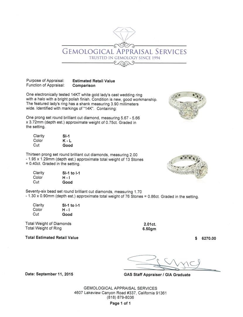 One electronically tested 14KT white gold lady's cast wedding ring with a halo with a bright polish finish. The featured lady's ring has a shank measuring 3.90 millimeters wide. Identified with markings of "14K". Condition is new, good workmanship. Containing: One prong set round brilliant cut diamond, measuring 5.67 - 5.66 x 3.72mm (depth est.) approximate weight of 0.75ct. Graded in the setting. Clarity: SI-1. Color: K - L. Cut Good Thirteen prong set round brilliant cut diamonds, measuring 2.00 - 1.95 x 1.29mm (depth est.) approximate total weight of 13 Stones = 0.40ct. Graded in the setting. Clarity: SI-1 to I-1. Color: H - I. Cut Good Seventy-Six bead set round brilliant cut diamonds, measuring 1.70 - 1.30 x 0.90mm (depth est.) approximate total weight of 76 Stones = 0.86ct. Graded in the setting. Clarity: SI-1 to I-1. Color: H - I. Cut Good. Total Weight of Diamonds 2.01ct. Total Weight of Ring 6.50gm. GAS Appraised at $6,270.00.