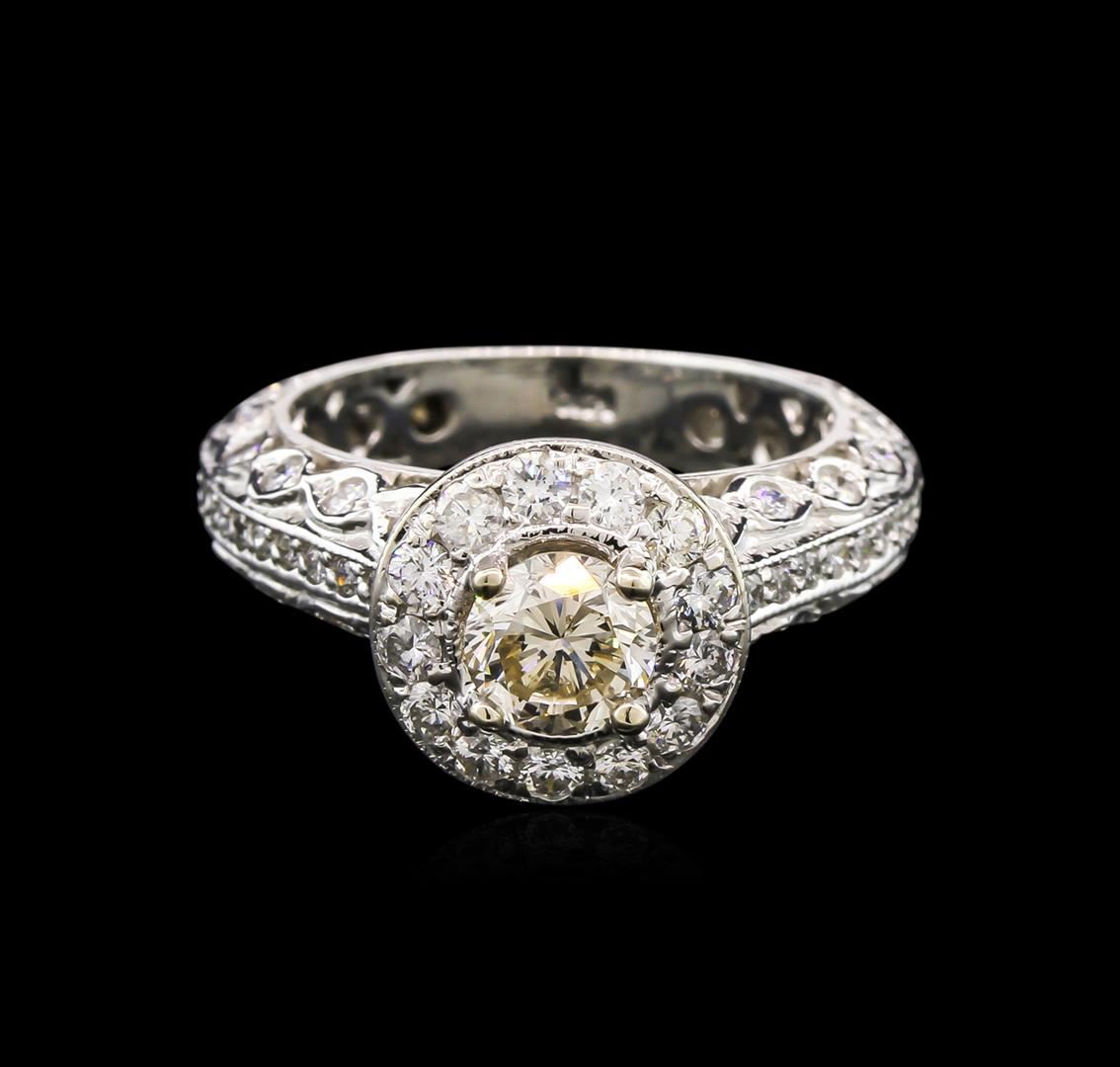 One electronically tested 14KT white gold lady's cast wedding ring with a halo with a bright polish finish. The featured lady's ring has a shank measuring 3.90 millimeters wide. Identified with markings of "14K". Condition is new, good workmanship. Containing: One prong set round brilliant cut diamond, measuring 5.67 - 5.66 x 3.72mm (depth est.) approximate weight of 0.75ct. Graded in the setting. Clarity: SI-1. Color: K - L. Cut Good Thirteen prong set round brilliant cut diamonds, measuring 2.00 - 1.95 x 1.29mm (depth est.) approximate total weight of 13 Stones = 0.40ct. Graded in the setting. Clarity: SI-1 to I-1. Color: H - I. Cut Good Seventy-Six bead set round brilliant cut diamonds, measuring 1.70 - 1.30 x 0.90mm (depth est.) approximate total weight of 76 Stones = 0.86ct. Graded in the setting. Clarity: SI-1 to I-1. Color: H - I. Cut Good. Total Weight of Diamonds 2.01ct. Total Weight of Ring 6.50gm. GAS Appraised at $6,270.00.