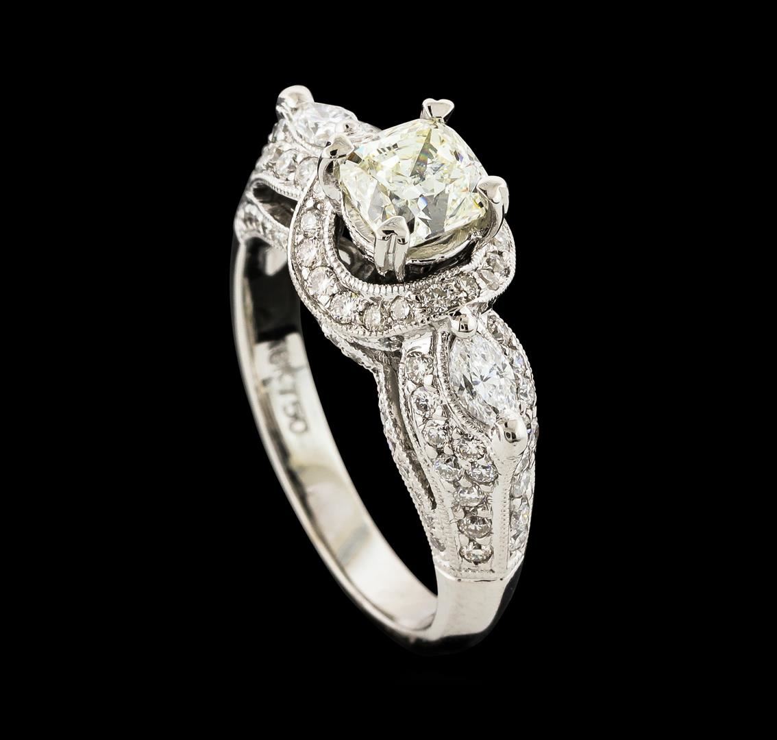 One electronically tested 18KT white gold lady's cast wedding ring with a knife edge cathedral shank with a bright polish with milgrain detailing finish. The featured lady's ring has a shank measuring 2.74 millimeters wide. Identified with markings of '18K 750'. Condition is new, good workmanship. Containing: One prong set cushion cut diamond, measuring 5.45 x 5.25 x 4.15mm (depth est.) approximate weight of 1.00ct. Graded in the setting. Clarity SI-3. Color: J - K Cut Good Two prong set marquise shaped cut diamonds, measuring 4.25 x 2.45 x 1.54mm (depth est.) approximate total weight of 2 Stones = 0.20ct. Graded in the setting. Clarity VS-2 to SI-1. Color: F - G Cut Very Good One Hundred Six prong set round brilliant cut diamonds, measuring 1.40 - 1.10 x 0.78mm (depth est.) approximate total weight of 106 Stones = 0.81ct. Graded in the setting. Clarity VS-2 to SI-2. Color: H - I Cut Good. Total Weight of Diamonds 2.01ct.. Total Weight of Ring 6.80gm. GAS Appraised at $10,835.00.