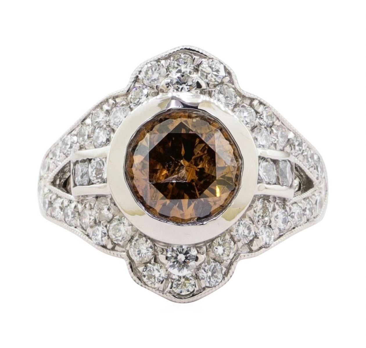One electronically tested platinum ladies cast & assembled diamond ring. The featured fancy brown diamond is set within a gallery of white diamonds, supported by an elaborate lattice undercarriage and diamond set shoulders, completed by a three millimeter wide band. Bright polish finish with milgrain detailing throughout. Trademark is Orianne. Identified with markings of "PT950". Condition is new, good workmanship. Containing: One bezel set round brilliant cut diamond, measuring 8.00 - 8.00 x 5.12mm (depth est.) approximate weight of 2.01ct. Graded in the setting. Clarity I-1 Depth 64.0% Table 62.5% Forty-Six bead set round brilliant cut diamonds, measuring 2.50 - 1.50 x 1.20mm (depth est.) approximate total weight of 46 Stones = 1.25ct. Graded in the setting. Clarity SI-1 to I-1 Color E - G Total Weight of Diamonds 3.26 ct. Total Weight of Ring 13.90 gm Estimated Retail Value $ 33,400.00 US