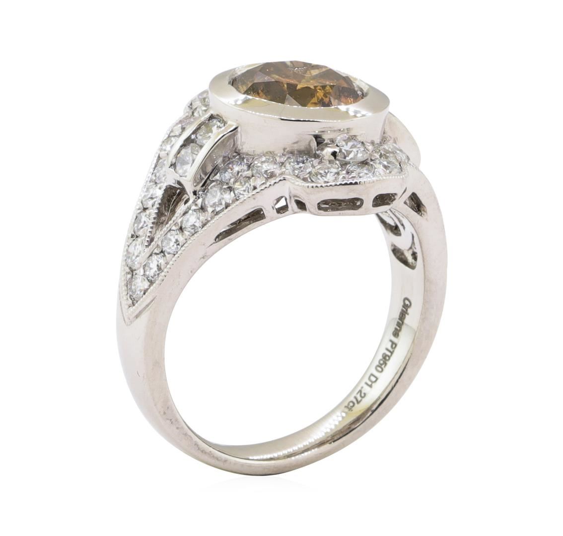 One electronically tested platinum ladies cast & assembled diamond ring. The featured fancy brown diamond is set within a gallery of white diamonds, supported by an elaborate lattice undercarriage and diamond set shoulders, completed by a three millimeter wide band. Bright polish finish with milgrain detailing throughout. Trademark is Orianne. Identified with markings of "PT950". Condition is new, good workmanship. Containing: One bezel set round brilliant cut diamond, measuring 8.00 - 8.00 x 5.12mm (depth est.) approximate weight of 2.01ct. Graded in the setting. Clarity I-1 Depth 64.0% Table 62.5% Forty-Six bead set round brilliant cut diamonds, measuring 2.50 - 1.50 x 1.20mm (depth est.) approximate total weight of 46 Stones = 1.25ct. Graded in the setting. Clarity SI-1 to I-1 Color E - G Total Weight of Diamonds 3.26 ct. Total Weight of Ring 13.90 gm Estimated Retail Value $ 33,400.00 US