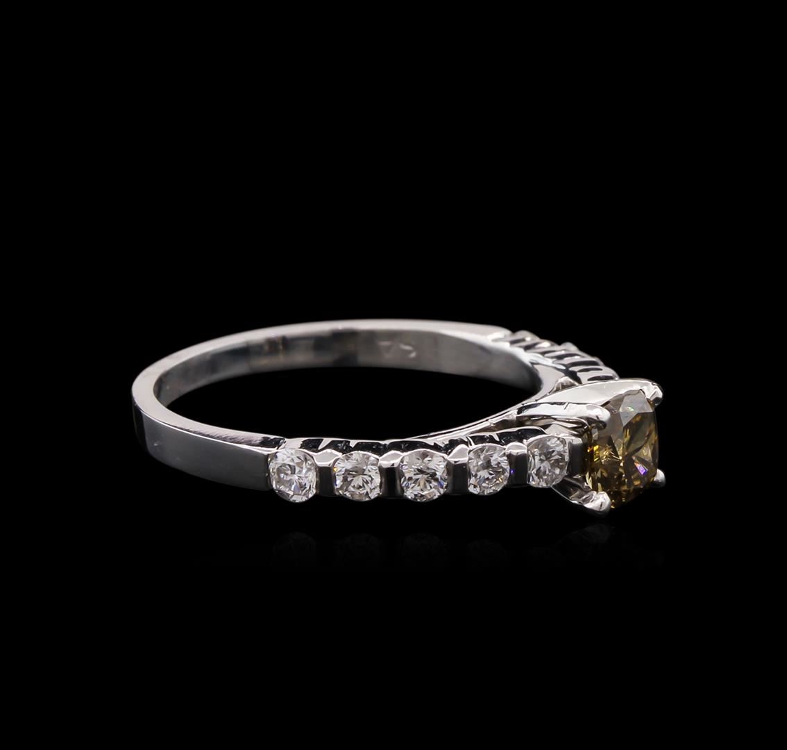 One electronically tested 14KT white gold lady's cast fashion ring with a cathedral shank with a bright polish finish. The featured lady's ring has a shank measuring 1.77 millimeters wide. Identified with markings of "14K". Condition is new, good workmanship. Containing: One prong set cushion cut diamond, measuring 4.69 x 4.28 x 2.80mm (depth est.) , 10.00.%. GTCF approximate weight of 0.54ct. Graded in the setting. Clarity: I-1 Cut Good Ten channel set round brilliant cut diamonds, measuring 2.30 - 2.25 x 1.48mm (depth est.) approximate total weight of 10 Stones = 0.47ct. Graded in the setting. Clarity: SI-2 to I-1. Color: H - I. Cut Good. Total Weight of Diamonds 1.01ct. Total Weight of Ring 2.60gm. GAS Appraised at $3,665.00.