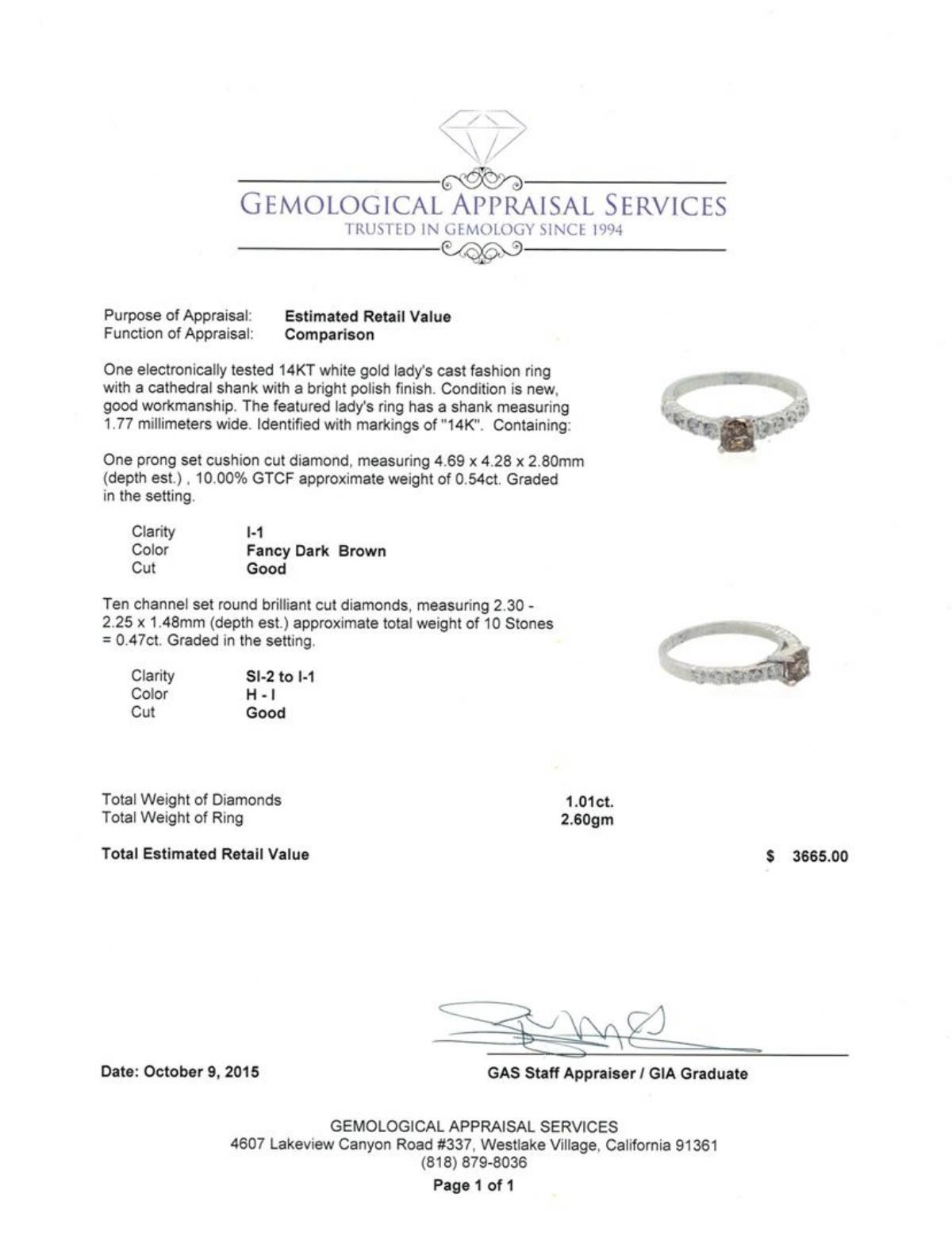 One electronically tested 14KT white gold lady's cast fashion ring with a cathedral shank with a bright polish finish. The featured lady's ring has a shank measuring 1.77 millimeters wide. Identified with markings of "14K". Condition is new, good workmanship. Containing: One prong set cushion cut diamond, measuring 4.69 x 4.28 x 2.80mm (depth est.) , 10.00.%. GTCF approximate weight of 0.54ct. Graded in the setting. Clarity: I-1 Cut Good Ten channel set round brilliant cut diamonds, measuring 2.30 - 2.25 x 1.48mm (depth est.) approximate total weight of 10 Stones = 0.47ct. Graded in the setting. Clarity: SI-2 to I-1. Color: H - I. Cut Good. Total Weight of Diamonds 1.01ct. Total Weight of Ring 2.60gm. GAS Appraised.