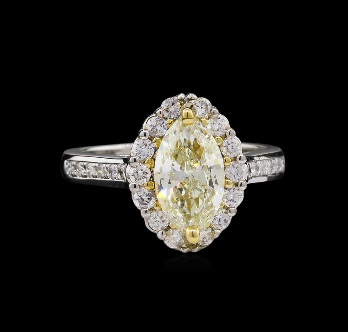 One electronically tested 14KT white and yellow gold lady's cast wedding ring with a basket halo with a bright polish finish. The featured lady's ring has a shank measuring 2.50 millimeters wide. Identified with markings of "14K". Condition is new, good workmanship. Containing: One prong set marquise shaped cut diamond, measuring 10.60 x 6.16 x 3.60mm (depth est.) , 10.00.%. GTCF approximate weight of 1.50ct. Graded in the setting. Clarity: SI-1 Cut Good Fourteen prong set round brilliant cut diamonds, measuring 2.00 - 1.90 x 1.17mm (depth est.) approximate total weight of 14 Stones = 0.38ct. Graded in the setting. Clarity: SI-1 to SI-2. Color: G - Good Twelve prong set round brilliant cut diamonds, measuring 1.40 - 1.35 x 0.87mm (depth est.) approximate total weight of 12 Stones = 0.13ct. Graded in the setting. Clarity: SI-1 to I-1. Color: G - I. Cut Good. Total Weight of Diamonds 2.01ct. Total Weight of Ring 4.80gm. GAS Appraised at $24,265.00.