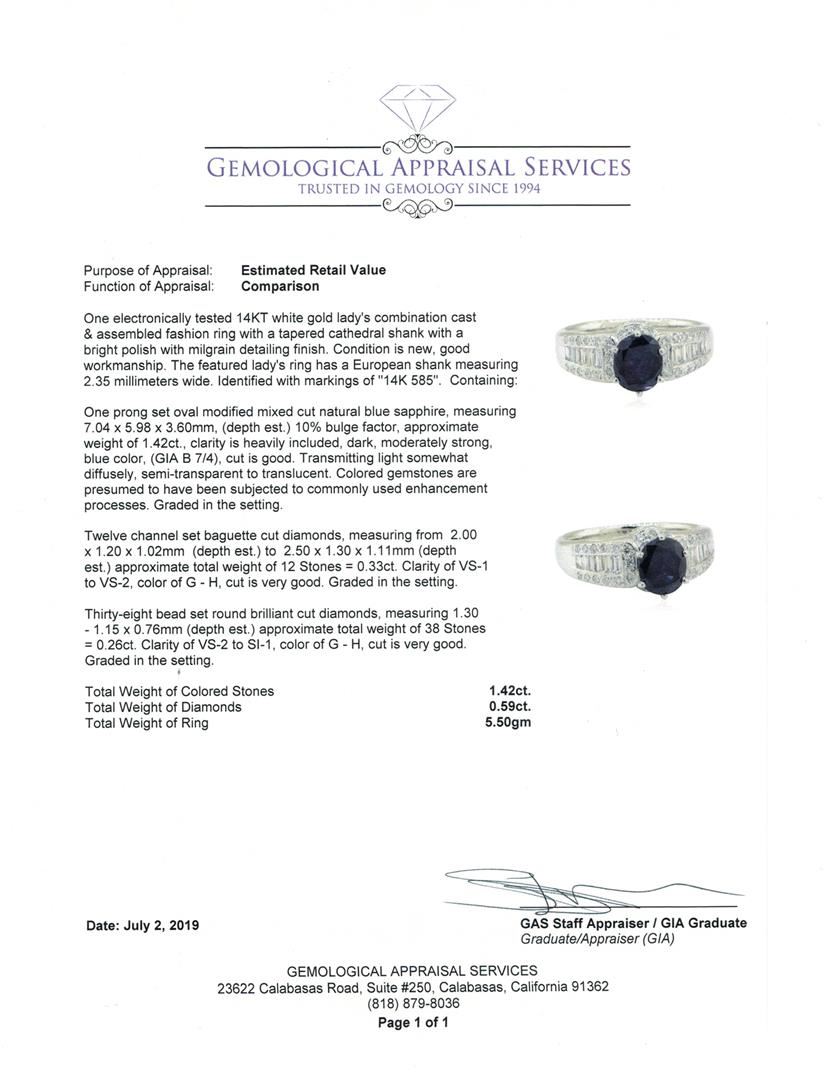 One electronically tested 14KT white gold lady's combination cast & assembled fashion ring with a tapered cathedral shank with a bright polish with milgrain detailing finish. The featured lady's ring has a European shank measuring 2.35 millimeters wide. Identified with markings of '14K 585'. Condition is new, good workmanship. Containing: One prong set oval modified mixed cut natural blue sapphire, measuring 7.04 x 5.98 x 3.60mm, (depth est.) 10%. bulge factor, approximate weight of 1.42ct., clarity is heavily included, dark, moderately strong, blue color, (GIA B 7/4), cut is good. Transmitting light somewhat diffusely, semi-transparent to translucent. Colored gemstones are presumed to have been subjected to commonly used enhancement processes. Graded in the setting. Twelve channel set baguette cut diamonds, measuring from 2.00 x 1.20 x 1.02mm (depth est.) to 2.50 x 1.30 x 1.11mm (depth est.) approximate total weight of 12 Stones = 0.33ct. Graded in the setting. Color G - H Clarity VS-1 to VS-2 Cut Very Good Thirty-Eight bead set round brilliant cut diamonds, measuring 1.30 - 1.15 x 0.76mm (depth est.) approximate total weight of 38 Stones = 0.26ct. Graded in the setting. Color G - H Clarity VS-2 to SI-1 Cut Very Good. Total Weight of Colored Stones 1.42ct.. Total Weight of Diamonds 0.59ct.. Total Weight of Ring 5.50gm GAS Appraised at $3705.00. GAS Appraised.