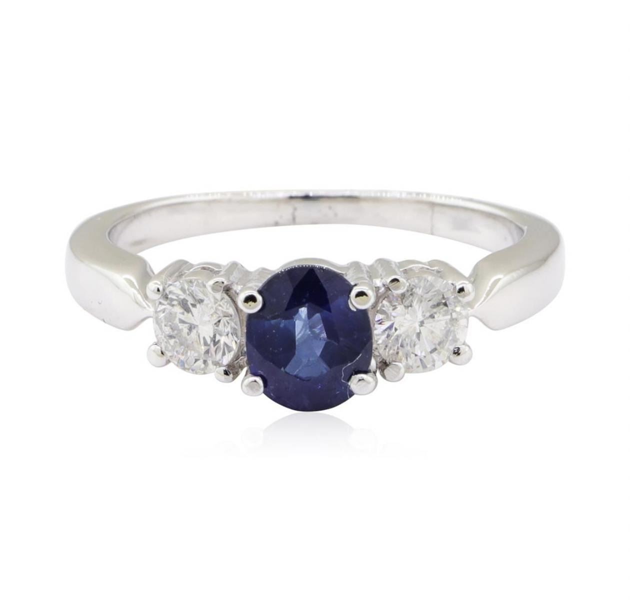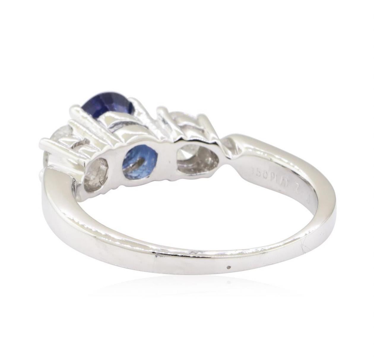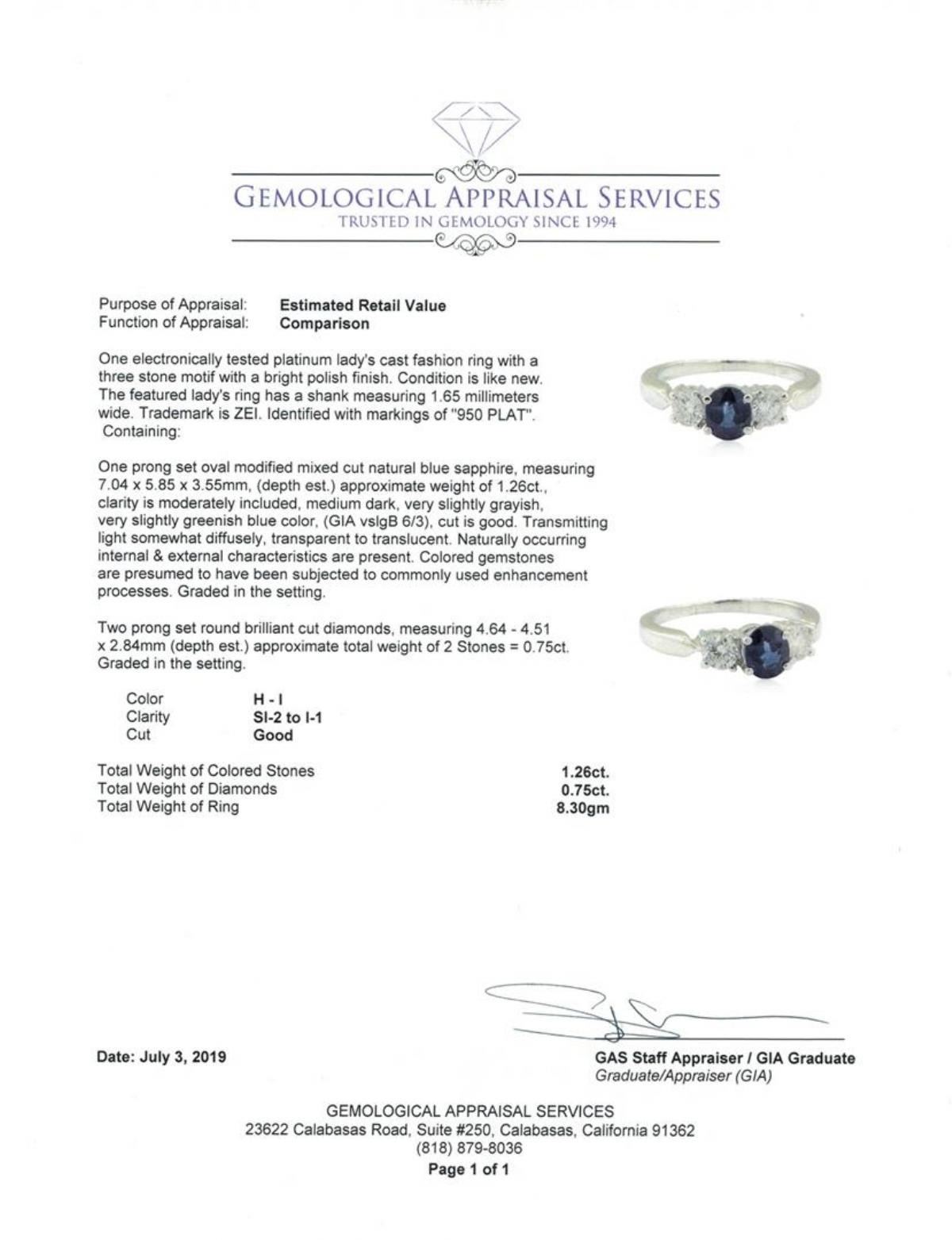 One electronically tested platinum lady's cast fashion ring with a three stone motif with a bright polish finish. The featured lady's ring has a shank measuring 1.65 millimeters wide. Trademark is ZEI. Identified with markings of '950 PLAT'. Condition is like new. Containing: One prong set oval modified mixed cut natural blue sapphire, measuring 7.04 x 5.85 x 3.55mm, (depth est.) approximate weight of 1.26ct., clarity is moderately included, medium dark, very slightly grayish, very slightly greenish blue color, (GIA vslgB 6/3), cut is good. Transmitting light somewhat diffusely, transparent to translucent. Naturally occurring internal & external characteristics are present. Colored gemstones are presumed to have been subjected to commonly used enhancement processes. Graded in the setting. Two prong set round brilliant cut diamonds, measuring 4.64 - 4.51 x 2.84mm (depth est.) approximate total weight of 2 Stones = 0.75ct. Graded in the setting. Color H - I Clarity SI-2 to I-1 Cut Good. Total Weight of Colored Stones 1.26ct.. Total Weight of Diamonds 0.75ct.. Total Weight of Ring 8.30gm GAS Appraised at $4270.00. GAS Appraised.