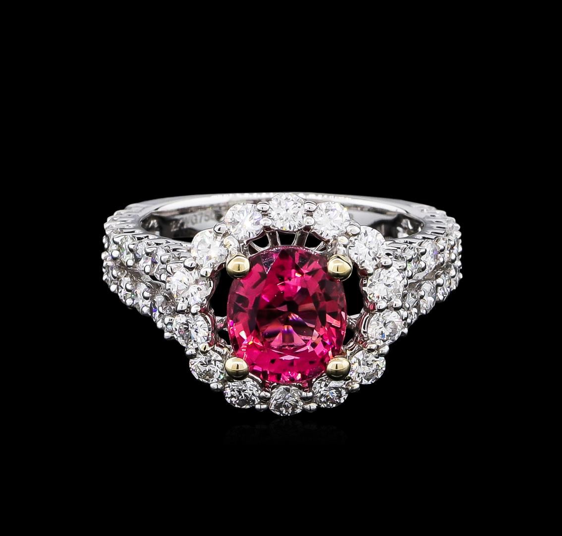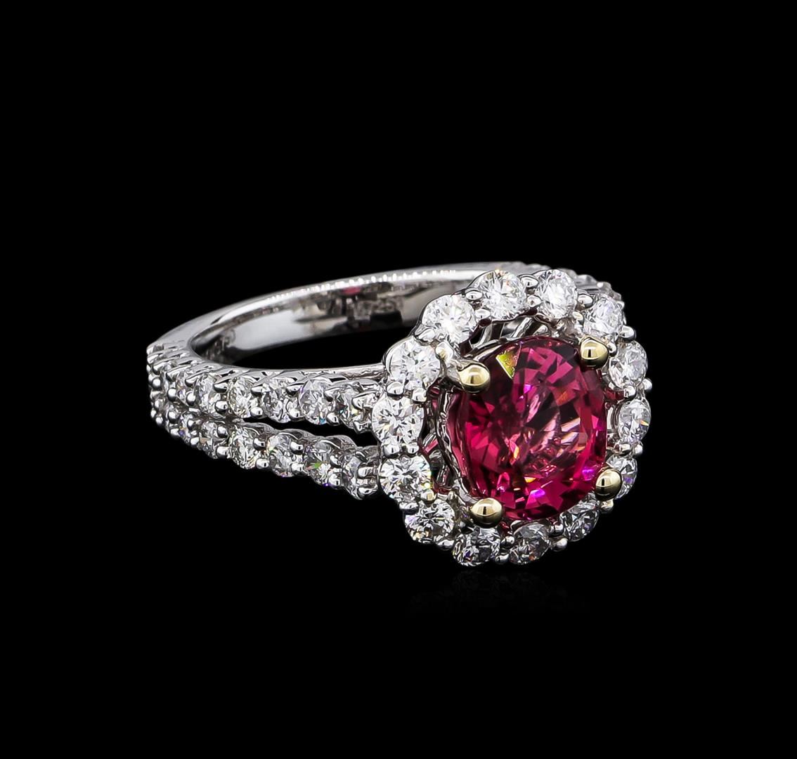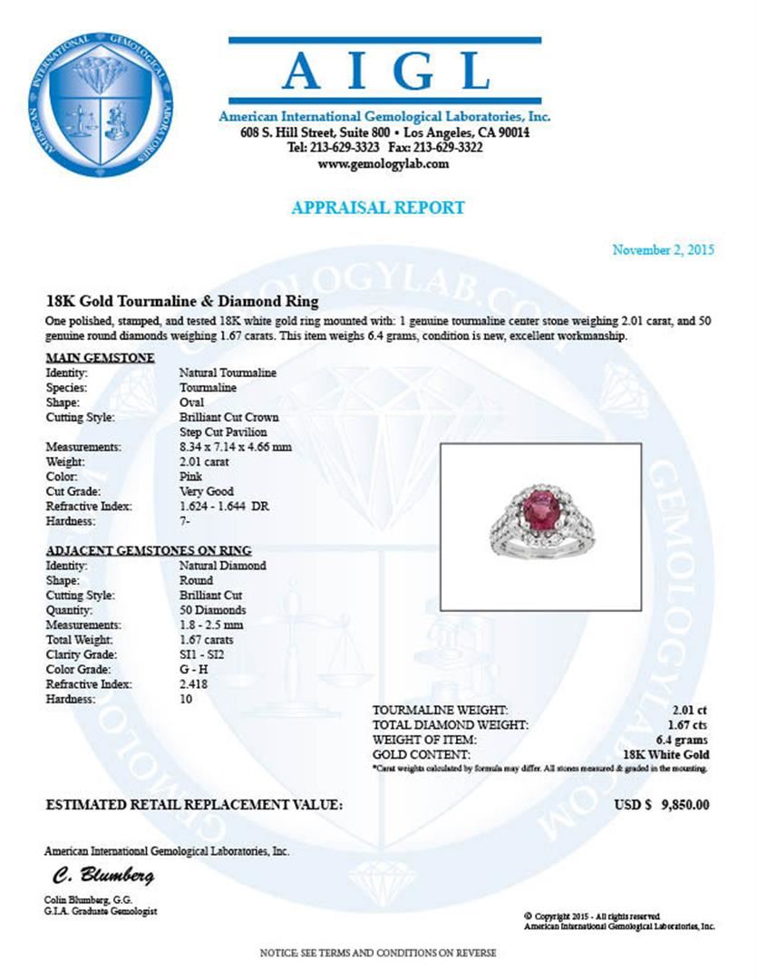 One polished, stamped, and tested 18KT white gold ring mounted with: 1 genuine tourmaline center stone weighing 2.01ct, and 50 genuine round diamonds weighing 1.67ct. This item weighs 6.40 grams, condition is new, excellent workmanship. MAIN GEMSTONE: Identify: Natural Tourmaline. Species: Tourmaline. Shape: Oval. Cutting Style: Brilliant cut crown; step cut pavilion. Measurements: 8.34 x 7.14 x 4.66mm. Weight: 2.01ct. Color: Pink. Cut Grade: Very good. Refractive Index: 1.624 - 1.644 DR. Hardness: 7. ADJACENT GEMSTONES ON RING: Identity: Natural Diamond. Shape: Round. Cutting Style: Brilliant cut. Quantity: 50 diamonds. Measurements: 1.8 - 2.5mm. Total Weight: 1.67ct. Clarity Grade: SI1 - SI2. Color Grade: G - H. Refractive Index: 2.418. Hardness: 10. AIGL Appraised at $9,850.00.