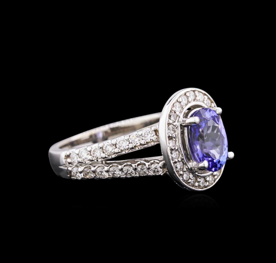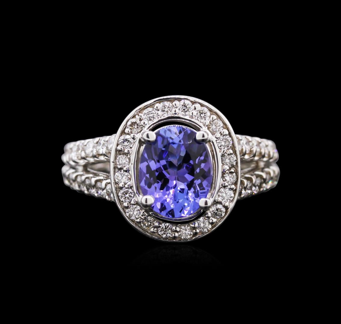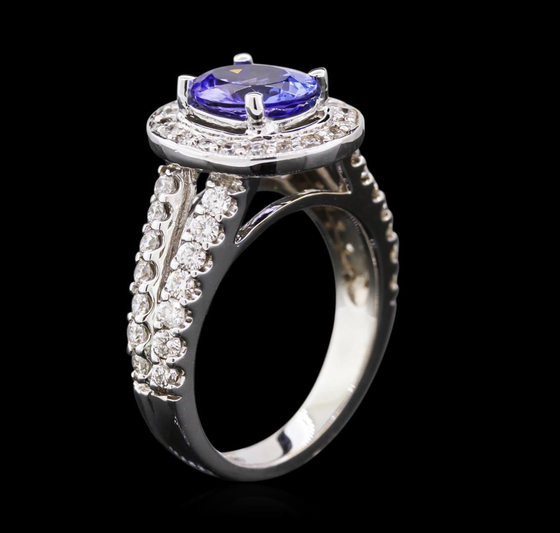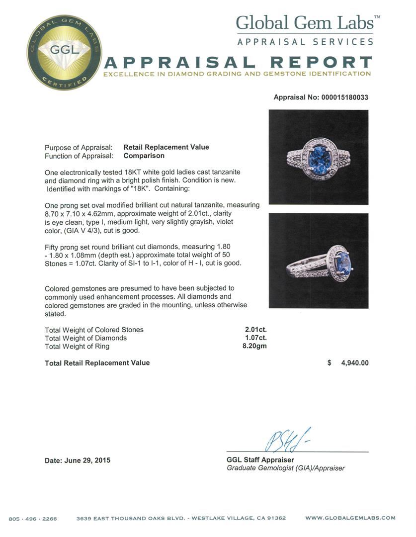 One electronically tested 18KT white gold ladies cast tanzanite and diamond ring with a bright polish finish. Identified with markings of "18K". Condition is new. Containing: One prong set oval modified brilliant cut natural tanzanite, measuring 8.70 x 7.10 x 4.62mm, approximate weight of 2.01ct., clarity is eye clean, type I, medium light, very slightly grayish, violet color, (GIA V 4/3), cut is good. Fifty prong set round brilliant cut diamonds, measuring 1.80 - 1.80 x 1.08mm (depth est.) approximate total weight of 50 Stones = 1.07ct. Clarity: SI-1 to I-1. Color: H - I, Cut is Good. Colored gemstones are presumed to have been subjected to commonly used enhancement processes. All diamonds and colored gemstones are graded in the mounting, unless otherwise stated. Total Weight of Colored Stones 2.01ct. Total Weight of Diamonds 1.07ct. Total Weight of Ring 8.20 grams. GGL Appraised at $4,940.00.