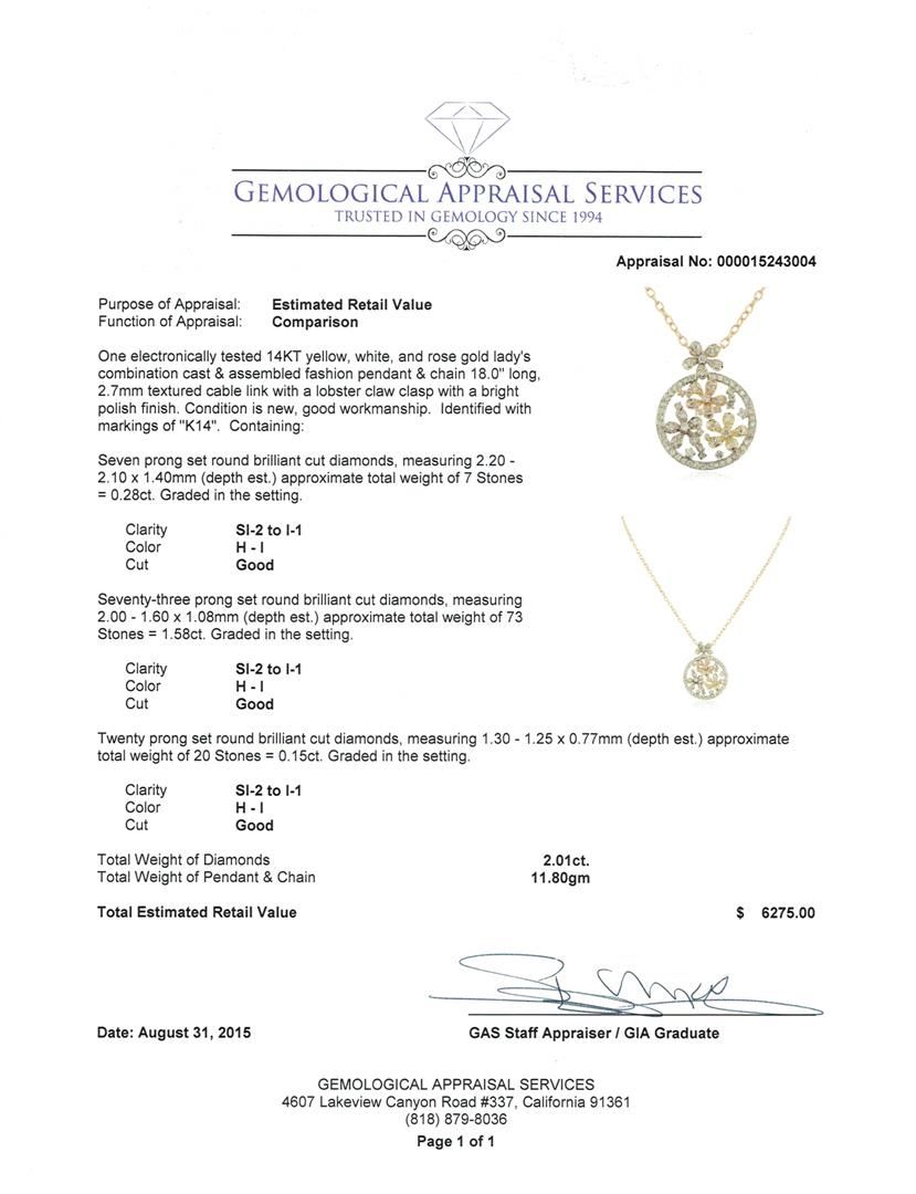 One electronically tested 14KT yellow, white, and rose gold lady's combination cast & assembled fashion pendant & chain 18.0" long, 2.7mm textured cable link with a lobster claw clasp with a bright polish finish. Identified with markings of "K14". Condition is new, good workmanship. Containing: Seven prong set round brilliant cut diamonds, measuring 2.20 - 2.10 x 1.40mm (depth est.) approximate total weight of 7 Stones = 0.28ct. Graded in the setting. Clarity: SI-2 to I-1. Color: H - I. Cut Good Seventy-Three prong set round brilliant cut diamonds, measuring 2.00 - 1.60 x 1.08mm (depth est.) approximate total weight of 73 Stones = 1.58ct. Graded in the setting. Clarity: SI-2 to I-1. Color: H - I. Cut Good Twenty prong set round brilliant cut diamonds, measuring 1.30 - 1.25 x 0.77mm (depth est.) approximate total weight of 20 Stones = 0.15ct. Graded in the setting. Clarity: SI-2 to I-1. Color: H - I. Cut Good. Total Weight of Diamonds 2.01ct. Total Weight of Pendant & Chain 11.80gm. GAS Appraised at $6,275.00.