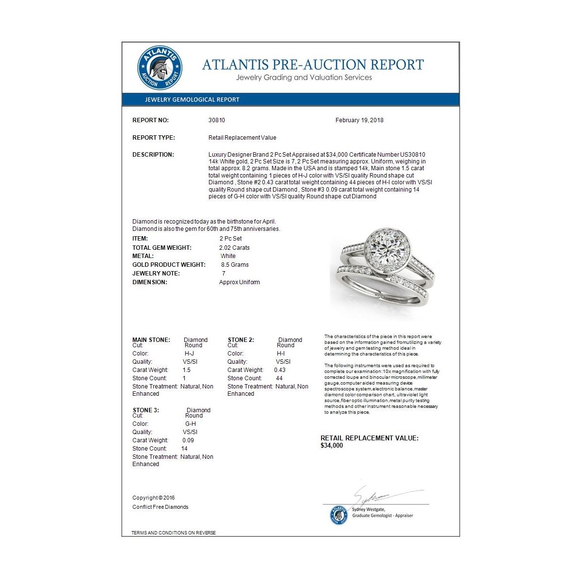 REF-566A8X -30810 ---- 2.02 CTW Certified VS/SI Diamond 2Pc Wedding Set Solitaire Halo 14K White Gold ---- Luxury Designer Brand 2 Pc Set Appraised at $34,000 Certificate Number US30810 14k White gold, 2 Pc Set Size is 7, 2 Pc Set measuring approx. Uniform, weighing in total approx. 8.2 grams. Made in the USA and is stamped 14k, Main stone 1.5 carat total weight containing 1 pieces of H-J color with VS/SI quality Round shape cut Diamond , Stone #2 0.43 carat total weight containing 44 pieces of H-I color with VS/SI quality Round shape cut Diamond , Stone #3 0.09 carat total weight containing 14 pieces of G-H color with VS/SI quality Round shape cut Diamond