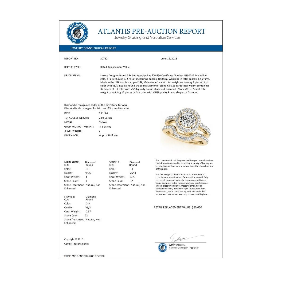 REF-417K5W -30782 ---- 2.02 CTW Certified VS/SI Diamond 2Pc Wedding Set Solitaire Halo 14K Yellow Gold ---- Luxury Designer Brand 2 Pc Set Appraised at $20,650 Certificate Number US30782 14k Yellow gold, 2 Pc Set Size is 7, 2 Pc Set measuring approx. Uniform, weighing in total approx. 8.5 grams. Made in the USA and is stamped 14k, Main stone 1 carat total weight containing 1 pieces of H-J color with VS/SI quality Round shape cut Diamond , Stone #2 0.65 carat total weight containing 32 pieces of H-I color with VS/SI quality Round shape cut Diamond , Stone #3 0.37 carat total weight containing 22 pieces of G-H color with VS/SI quality Round shape cut Diamond