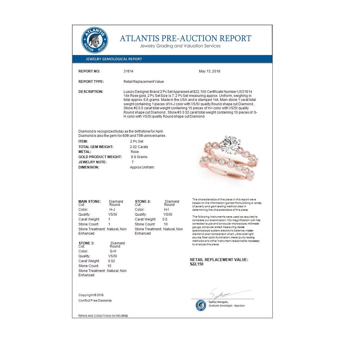 REF-402N8Y -31614 ---- 2.02 CTW Certified VS/SI Diamond Solitaire 2Pc Wedding Set 14K Rose Gold ---- Luxury Designer Brand 2 Pc Set Appraised at $22,150 Certificate Number US31614 14k Rose gold, 2 Pc Set Size is 7, 2 Pc Set measuring approx. Uniform, weighing in total approx. 6.6 grams. Made in the USA and is stamped 14k, Main stone 1 carat total weight containing 1 pieces of H-J color with VS/SI quality Round shape cut Diamond , Stone #2 0.5 carat total weight containing 10 pieces of H-I color with VS/SI quality Round shape cut Diamond , Stone #3 0.52 carat total weight containing 10 pieces of G-H color with VS/SI quality Round shape cut Diamond
