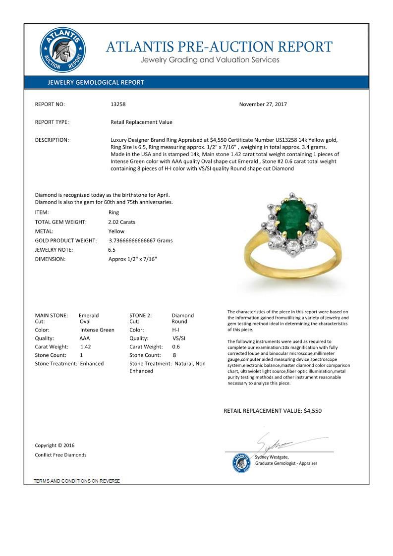 REF-69A3X -13258 ---- 2.02 CTW Emerald & Diamond Ring 14K Yellow Gold ---- Luxury Designer Brand Ring Appraised at $4,550 Certificate Number US13258 14k Yellow gold, Ring Size is 6.5, Ring measuring approx. 1/2" x 7/16" , weighing in total approx. 3.4 grams. Made in the USA and is stamped 14k, Main stone 1.42 carat total weight containing 1 pieces of Intense Green color with AAA quality Oval shape cut Emerald , Stone #2 0.6 carat total weight containing 8 pieces of H-I color with VS/SI quality Round shape cut Diamond