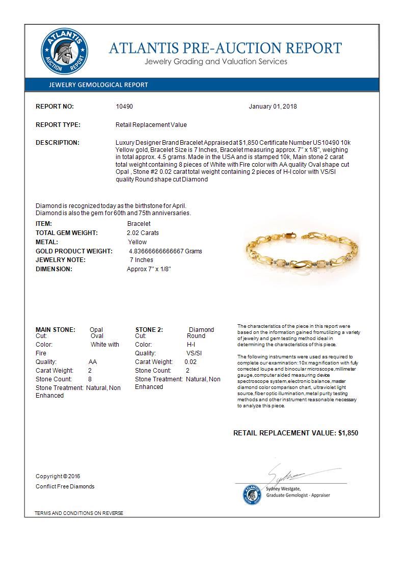 REF-28W2F -10490 ---- 2.02 CTW Opal & Diamond Bracelet 10K Yellow Gold ---- Luxury Designer Brand Bracelet Appraised at $1,850 Certificate Number US10490  10k Yellow gold,  Bracelet Size is 7 Inches, Bracelet measuring approx. 7" x  1/8", weighing in total approx. 4.5 grams. Made in the USA and is stamped 10k, Main stone 2 carat total weight containing 8 pieces of White with Fire color with AA  quality Oval shape cut Opal , Stone #2 0.02 carat total weight containing 2 pieces of H-I color with  VS/SI quality Round shape cut Diamond