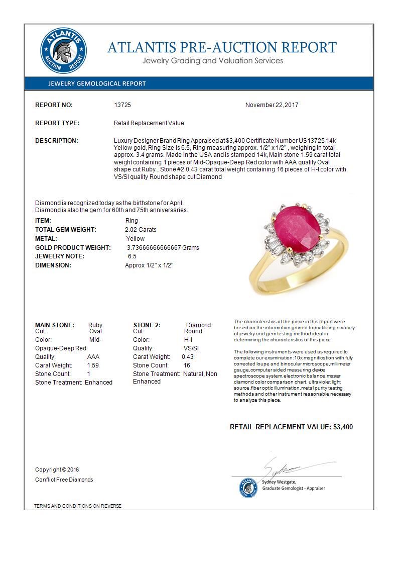13725 - REF-47F8N ---- 2.02 CTW Ruby & Diamond Ring 14K Yellow Gold ---- Luxury Designer Brand Ring Appraised at $3,400 Certificate Number US13725 14k Yellow gold, Ring Size is 6.5, Ring measuring approx. 1/2" x 1/2" , weighing in total approx. 3.4 grams. Made in the USA and is stamped 14k, Main stone 1.59 carat total weight containing 1 pieces of Mid-Opaque-Deep Red color with AAA quality Oval shape cut Ruby , Stone #2 0.43 carat total weight containing 16 pieces of H-I color with VS/SI quality Round shape cut Diamond