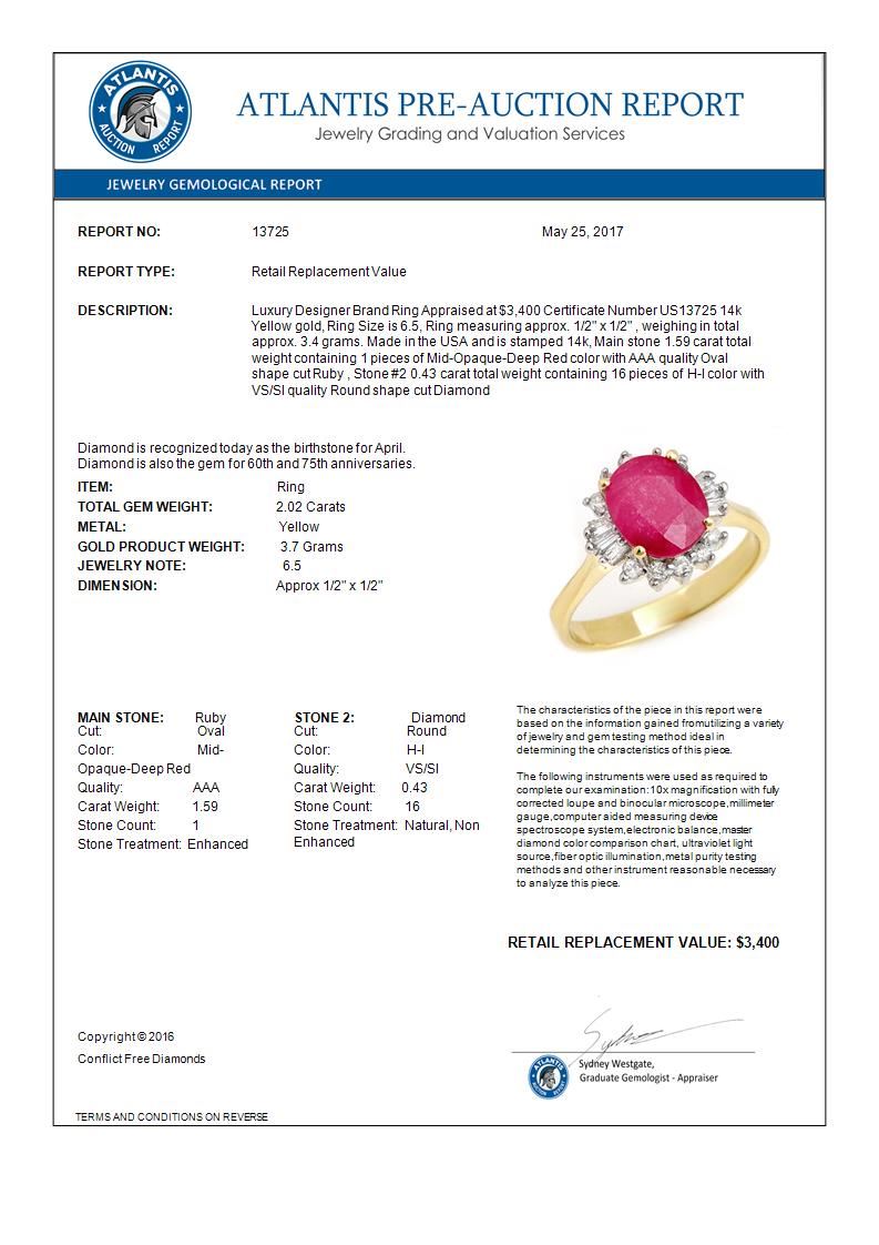 2.02 CTW Ruby & Diamond Ring 14K Yellow Gold ---- Luxury Designer Brand Ring Appraised Retail Price at $3,400 ---- SKU Number US13725 14k Yellow gold Ring Size is 6.5, Ring measuring approx. 1/2" x 1/2" , weighing in total approx. 3.4 grams. Made in the USA and is stamped 14k, Main stone 1.59 carat total weight containing 1 pieces of Mid-Opaque-Deep Red color with AAA quality Oval shape cut Ruby , Stone #2 0.43 carat total weight containing 16 pieces of H-I color with VS/SI quality Round shape cut
