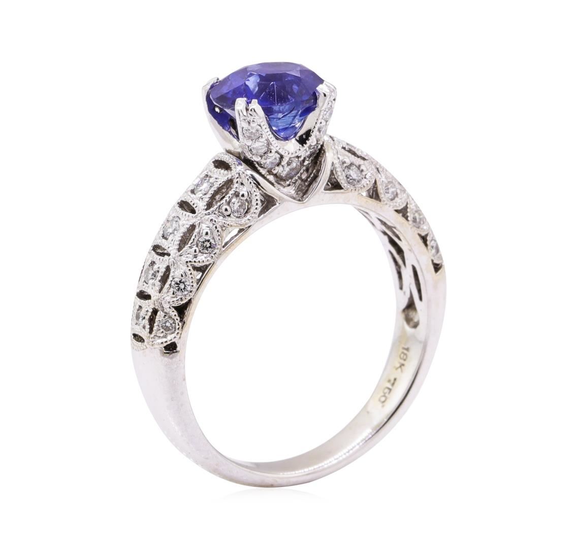 One electronically tested 18KT white gold lady's combination cast & assembled vintage style fashion ring with a domed cathedral shank with a bright polish with milgrain detailing finish. The featured lady's ring has a shank measuring 3.00 millimeters wide. Identified with markings of '18K 750'. Condition is like new, good workmanship. Containing: One prong set oval modified mixed cut natural blue sapphire, measuring 7.57 x 6.05 x 4.40mm, (depth est.) approximate weight of 1.67ct., clarity is heavily included, medium dark, strong, violetish blue color, (GIA vB 6/5), cut is good. Transmitting light somewhat diffusely, semi-transparent to translucent. Colored gemstones are presumed to have been subjected to commonly used enhancement processes. Graded in the setting. Two prong set round brilliant cut diamonds, measuring 1.75 - 1.70 x 1.07mm (depth est.) approximate total weight of 2 Stones = 0.04ct. Graded in the setting. Color H - I Clarity SI-2 to I-1 Cut Good Thirty-Six prong set round brilliant cut diamonds, measuring 1.50 - 1.00 x 0.78mm (depth est.) approximate total weight of 36 Stones = 0.31ct. Graded in the setting. Color H - I Clarity SI-2 to I-1 Cut Good. Total Weight of Colored Stones 1.67ct.. Total Weight of Diamonds 0.35ct.. Total Weight of Ring 5.90gm GAS Appraised at $4510.00. GAS Appraised.