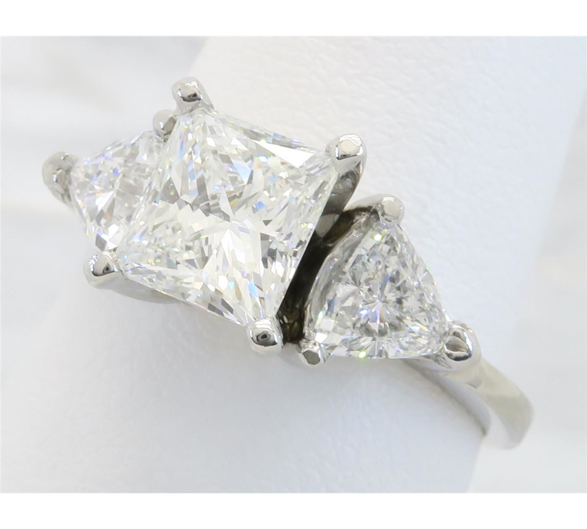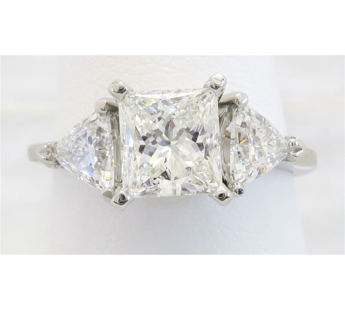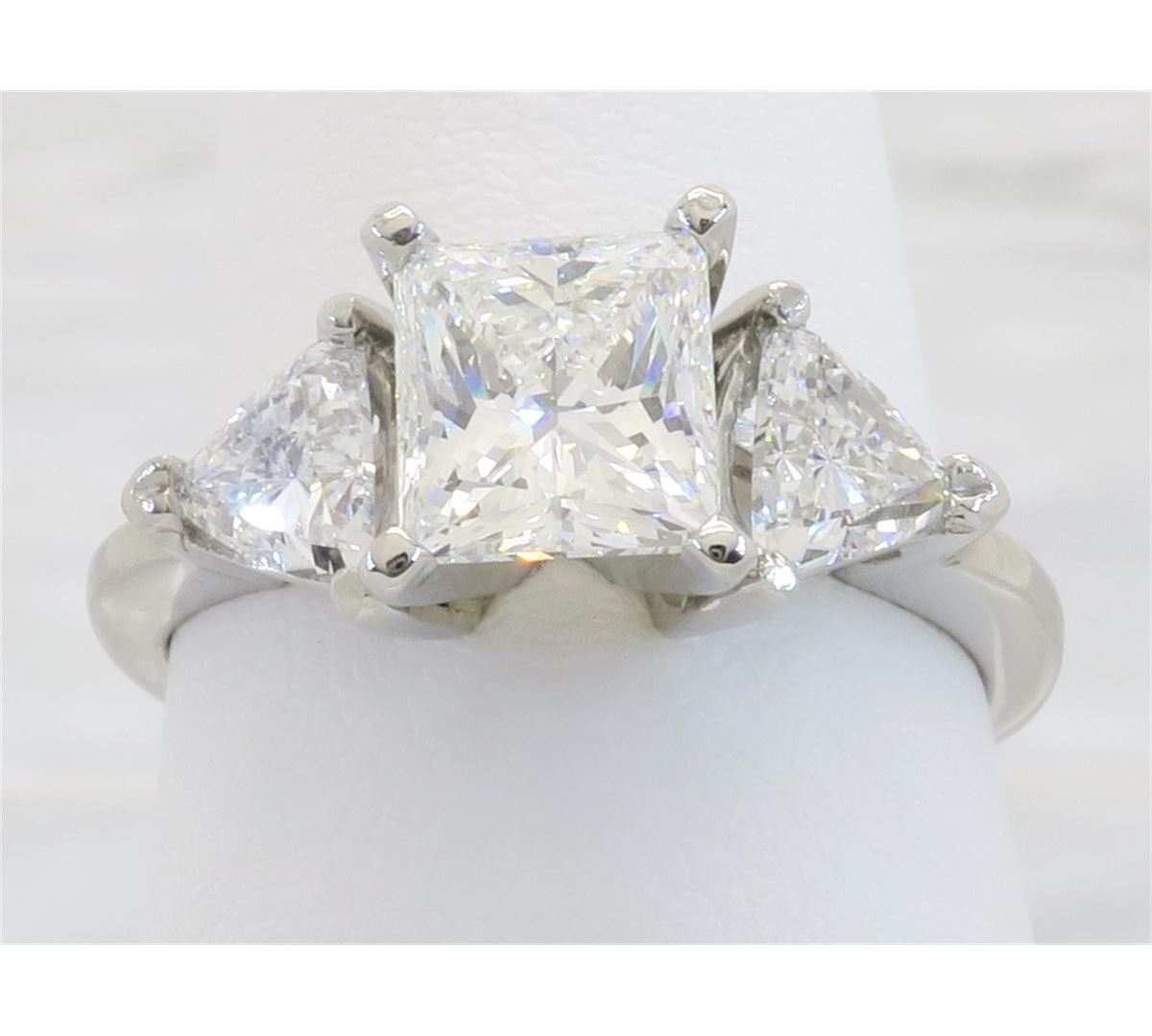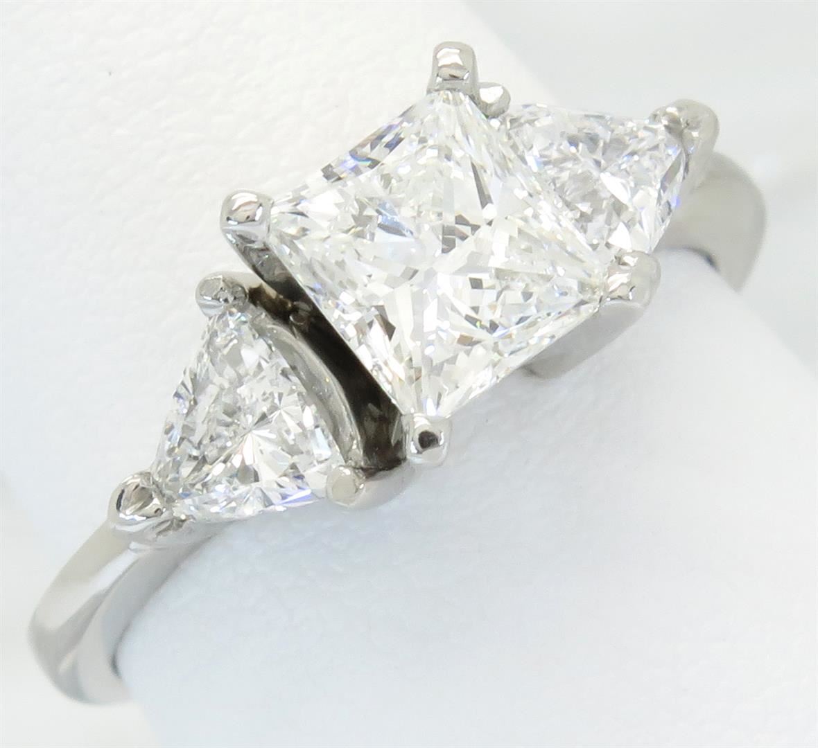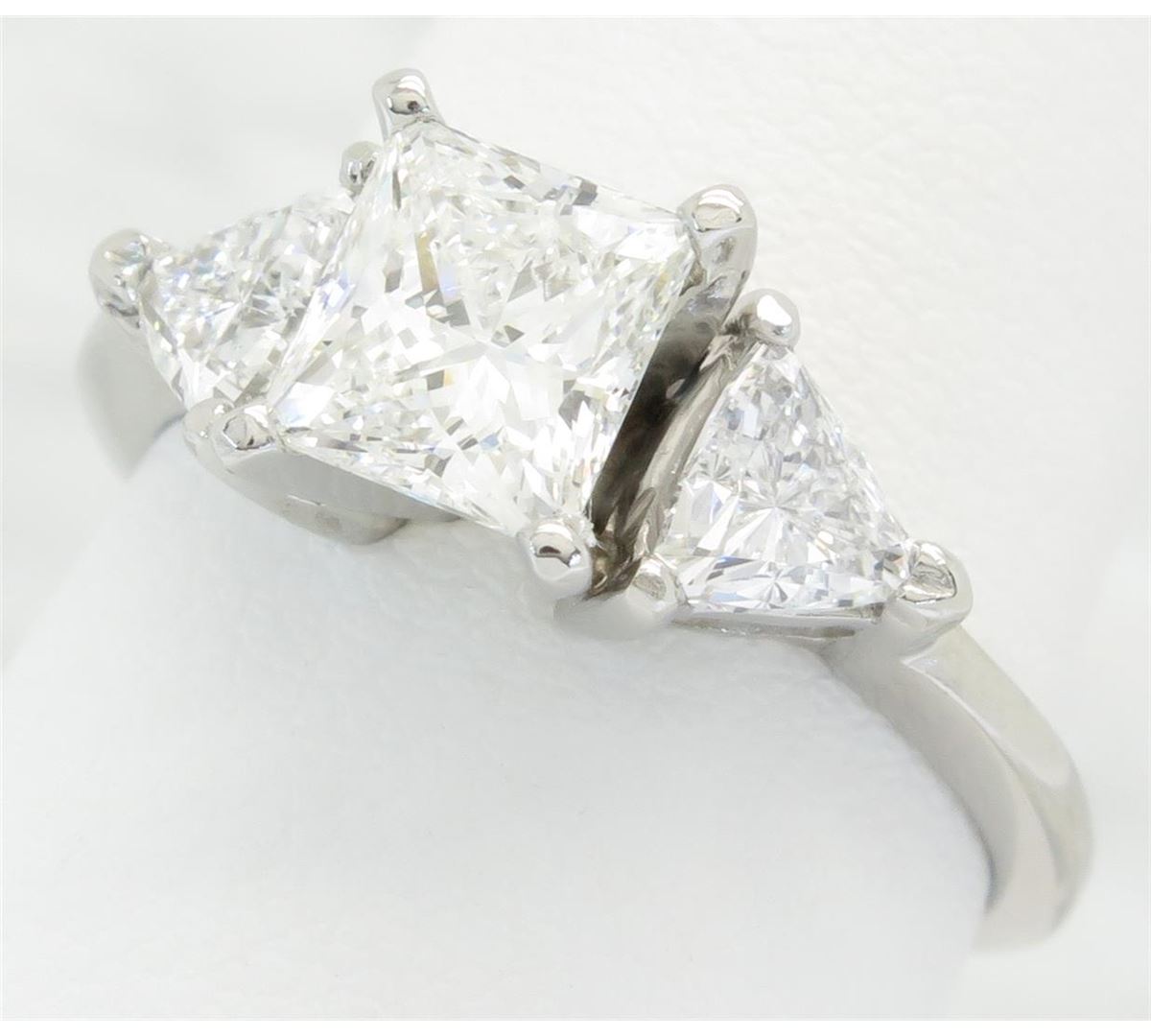 One tested platinum diamond ring. Containing: One GIA Certified Princess Cut Diamond. Size: 1.23CT, Clarity: VS2, Color: G. Two Trilliant Cut Diamonds. Approximate total diamond weight: 2.02CTW. All diamonds are graded in the mounting unless otherwise stated. Weight of ring: 5.2 grams, Size: 6.5.