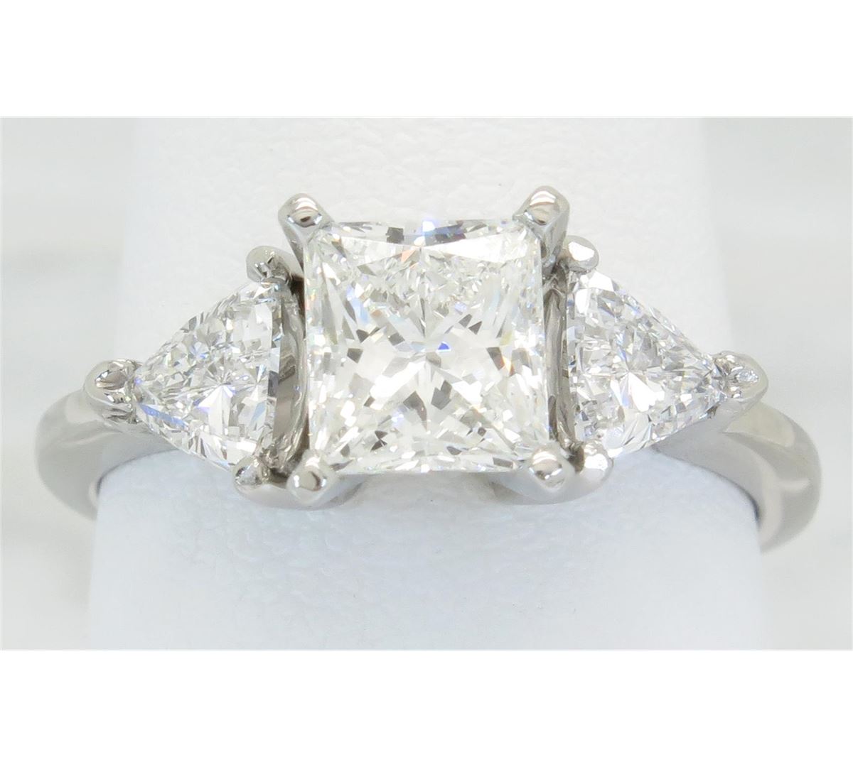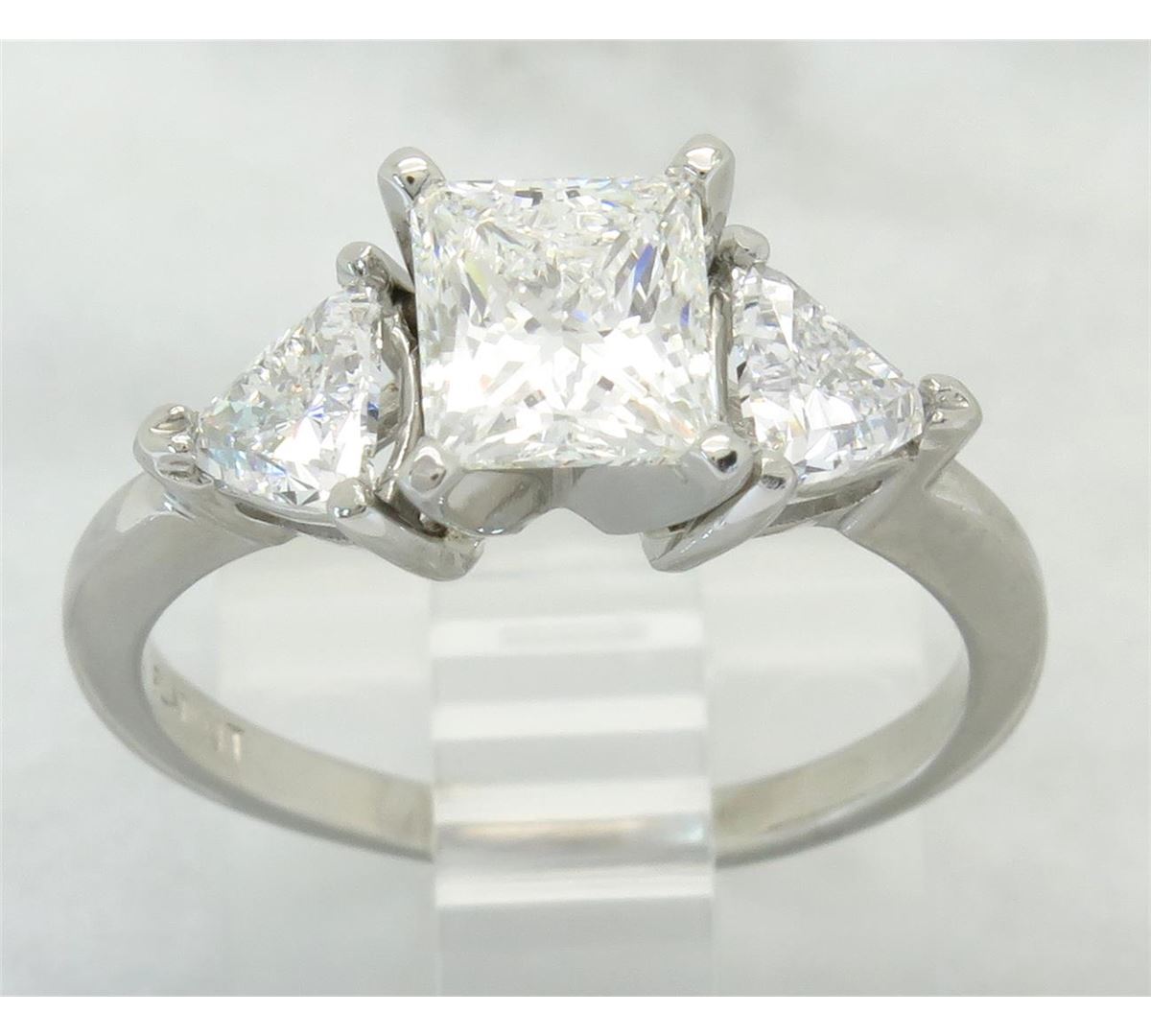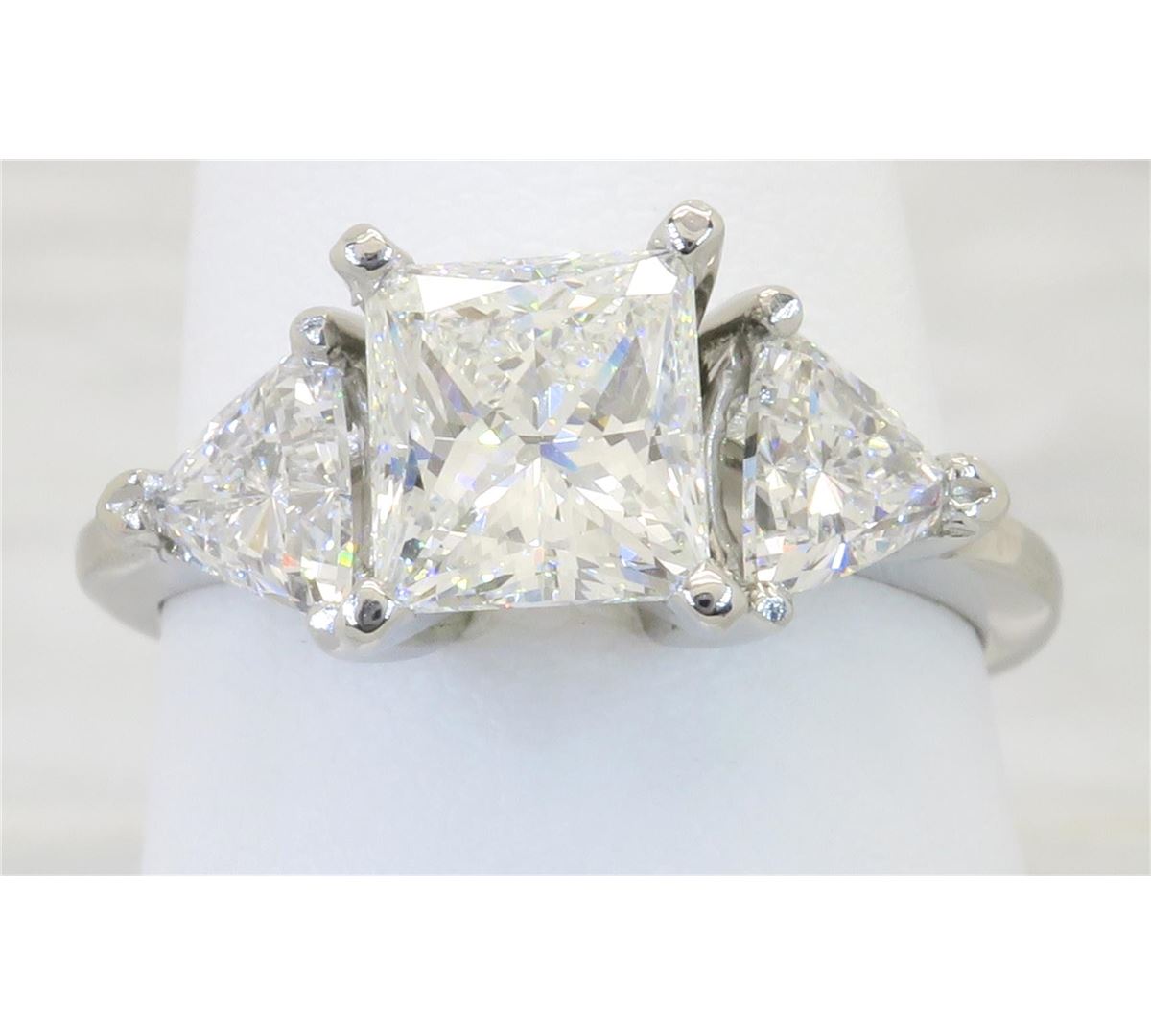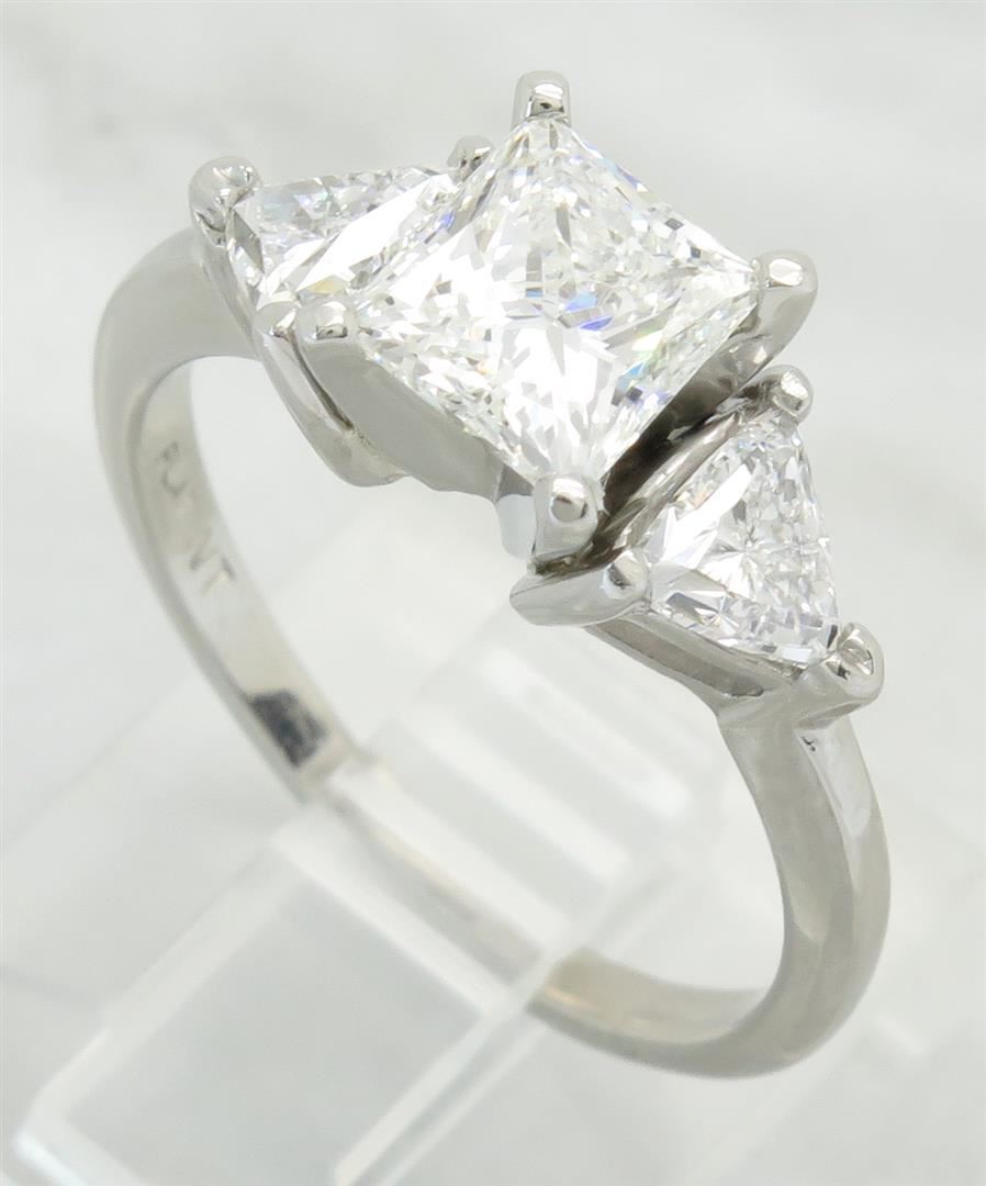 One tested platinum diamond ring. Containing: One GIA Certified Princess Cut Diamond. Size: 1.23CT, Clarity: VS2, Color: G. Two Trilliant Cut Diamonds. Approximate total diamond weight: 2.02CTW. All diamonds are graded in the mounting unless otherwise stated. Weight of ring: 5.2 grams, Size: 6.5.