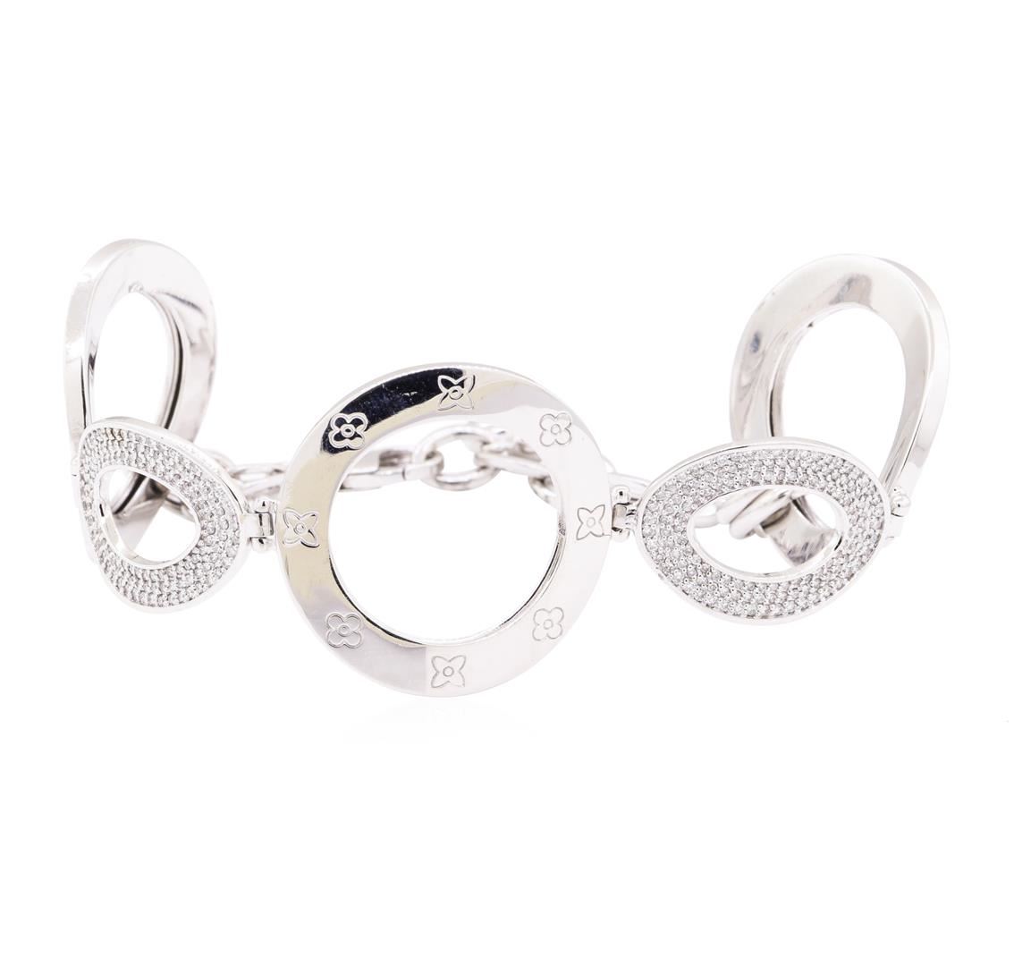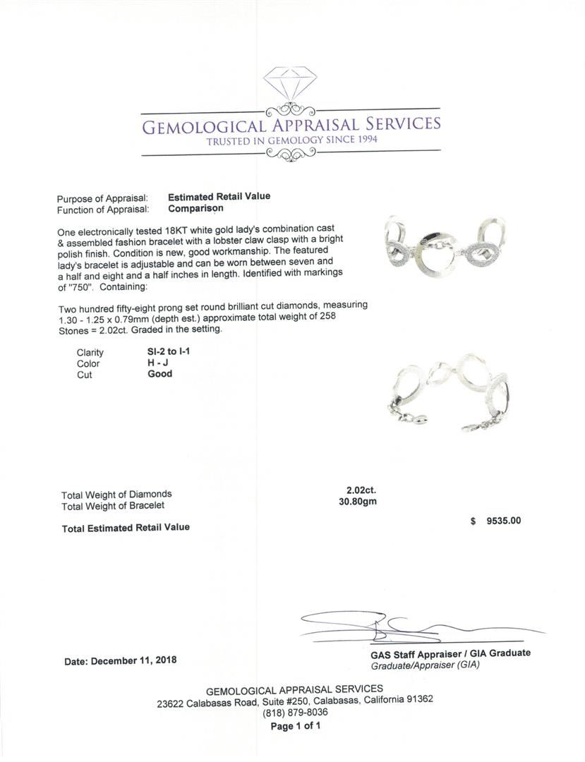 One electronically tested 18KT white gold lady's combination cast & assembled fashion bracelet with a lobster claw clasp with a bright polish finish. The featured lady's bracelet is adjustable and can be worn between seven and a half and eight and a half inches in length. Identified with markings of '750'. Condition is new, good workmanship. Containing: Two Hundred Fifty-Eight prong set round brilliant cut diamonds, measuring 1.30 - 1.25 x 0.79mm (depth est.) approximate total weight of 258 Stones = 2.02ct. Graded in the setting. Color H - J Clarity SI-2 to I-1 Cut Good. Total Weight of Diamonds 2.02ct.. Total Weight of Bracelet 30.80gm GAS Appraised at $9535.00. GAS Appraised at $9,535.00.