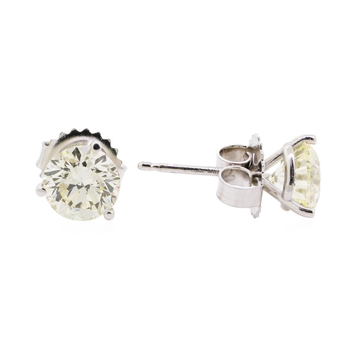 One pair electronically tested 14KT white gold lady's cast fashion stud earrings with heavy friction backs with a three prong basket with a bright polish finish. Identified with markings of '14K'. Condition is new, good workmanship. Containing: Two prong set round brilliant cut diamonds, measuring 6.25 - 6.20 x 4.00mm (depth est.) , 7.00.%. GTCF approximate total weight of 2 Stones = 2.02ct. Graded in the setting. Color I - J Clarity VS-1 to VS-2 Cut Very Good. Total Weight of Diamonds 2.02ct.. Total Weight of Earrings 1.20gm GAS Appraised at $22865.00. GAS Appraised at $22,865.00.