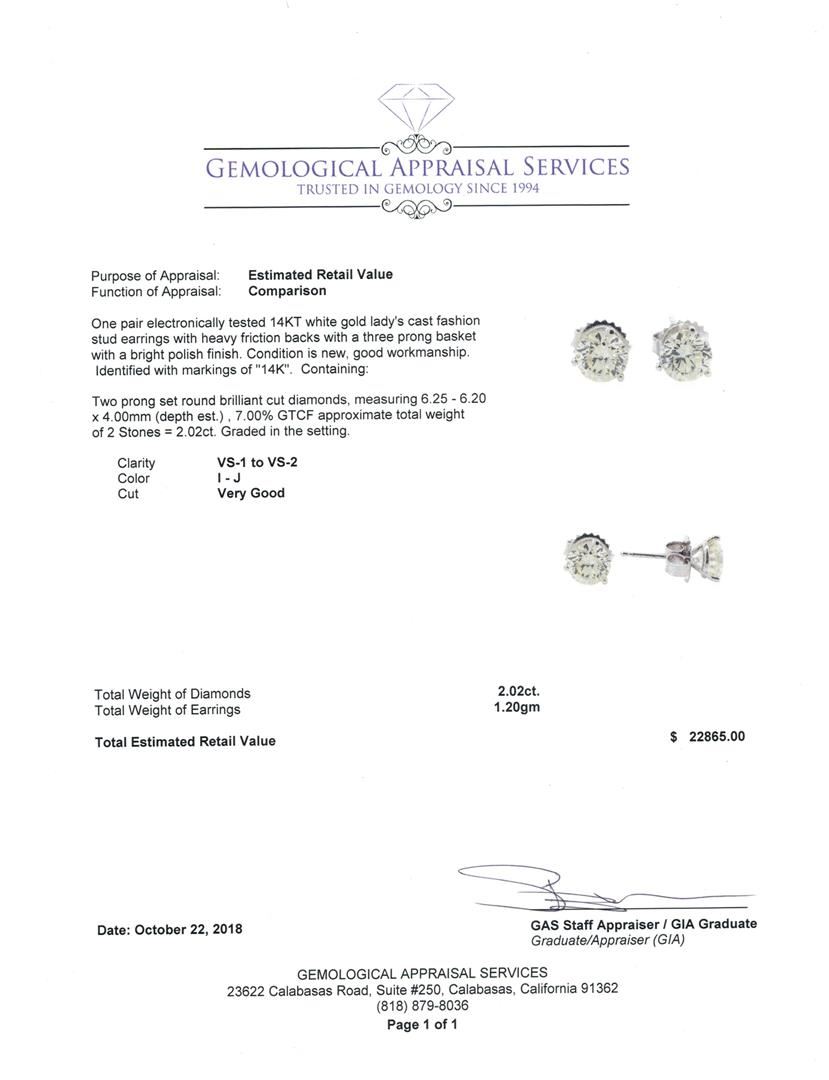 One pair electronically tested 14KT white gold lady's cast fashion stud earrings with heavy friction backs with a three prong basket with a bright polish finish. Identified with markings of '14K'. Condition is new, good workmanship. Containing: Two prong set round brilliant cut diamonds, measuring 6.25 - 6.20 x 4.00mm (depth est.) , 7.00.%. GTCF approximate total weight of 2 Stones = 2.02ct. Graded in the setting. Color I - J Clarity VS-1 to VS-2 Cut Very Good. Total Weight of Diamonds 2.02ct.. Total Weight of Earrings 1.20gm GAS Appraised at $22865.00. GAS Appraised at $22,865.00.