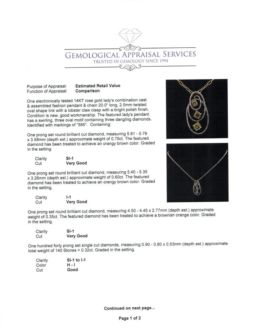One electronically tested 14KT rose gold lady's combination cast & assembled fashion pendant & chain 20.0' long, 2.5mm twisted oval shape link with a lobster claw clasp with a bright polish finish. The featured lady's pendant has a swirling, three oval motif containing three dangling diamonds. Identified with markings of '585'. Condition is new, good workmanship. Containing: One prong set round brilliant cut diamond, measuring 5.81 - 5.79 x 3.58mm (depth est.) approximate weight of 0.75ct. The featured diamond has been treated to achieve an orangy brown color. Graded in the setting. Clarity SI-1 Cut Very Good One prong set round brilliant cut diamond, measuring 5.40 - 5.35 x 3.26mm (depth est.) approximate weight of 0.60ct. The featured diamond has been treated to achieve an orangy brown color. Graded in the setting. Clarity I-1 Cut Very Good One prong set round brilliant cut diamond, measuring 4.50 - 4.45 x 2.77mm (depth est.) approximate weight of 0.35ct. The featured diamond has been treated to achieve a brownish orange color. Graded in the setting. Clarity SI-1 Cut Very Good One Hundred Forty prong set single cut diamonds, measuring 0.90 - 0.80 x 0.53mm (depth est.) approximate total weight of 140 Stones = 0.32ct. Graded in the setting. Clarity SI-1 to I-1. Color: H - I Cut Good. Total Weight of Diamonds 2.02ct.. Total Weight of Pendant & Chain 9.20gm GAS Appraised at $8,135.00.