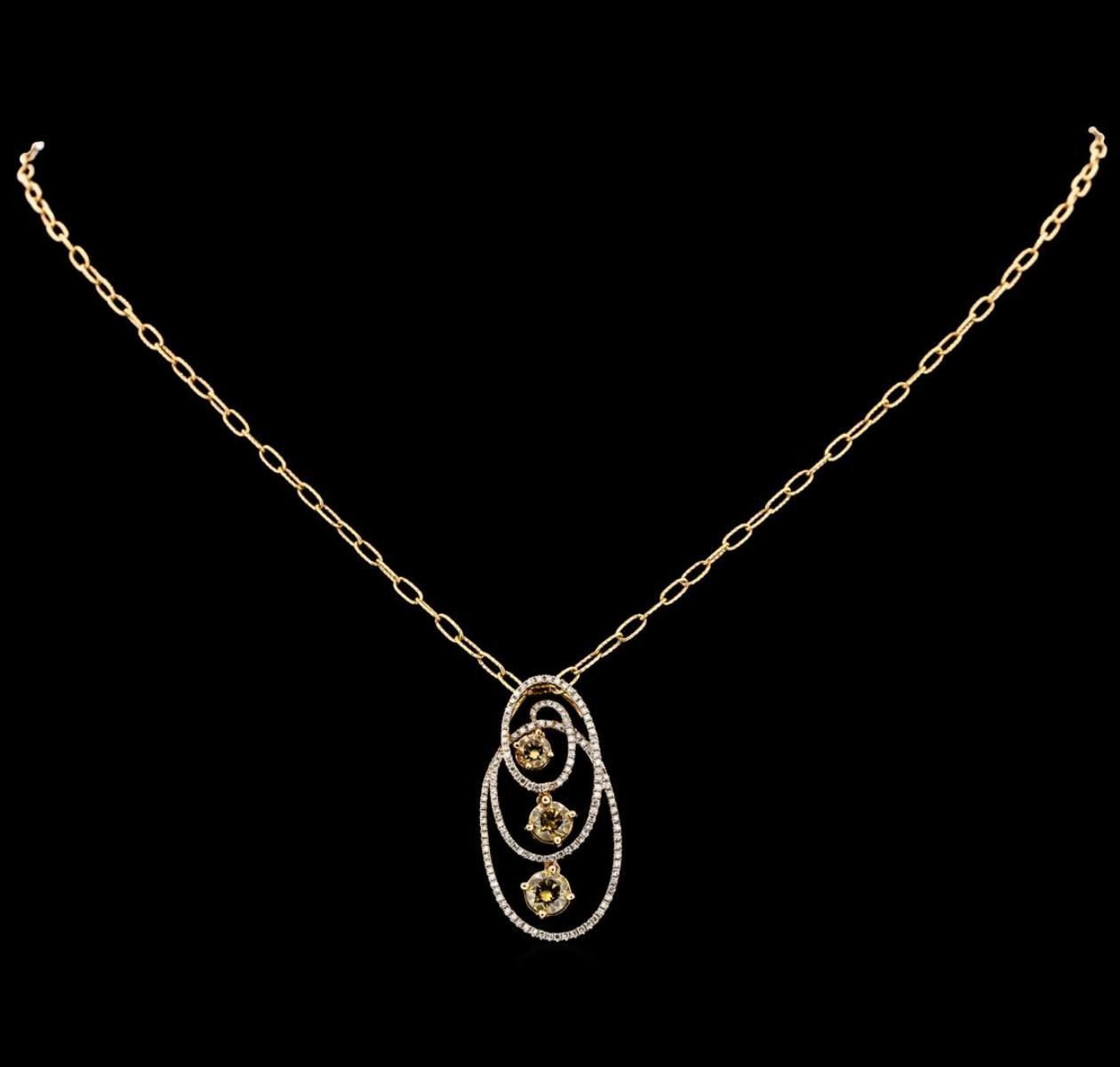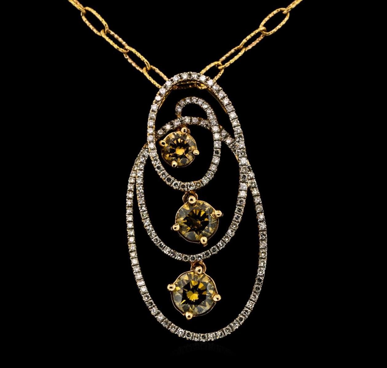 One electronically tested 14KT rose gold lady's combination cast & assembled fashion pendant & chain 20.0' long, 2.5mm twisted oval shape link with a lobster claw clasp with a bright polish finish. The featured lady's pendant has a swirling, three oval motif containing three dangling diamonds. Identified with markings of '585'. Condition is new, good workmanship. Containing: One prong set round brilliant cut diamond, measuring 5.81 - 5.79 x 3.58mm (depth est.) approximate weight of 0.75ct. The featured diamond has been treated to achieve an orangy brown color. Graded in the setting. Clarity SI-1 Cut Very Good One prong set round brilliant cut diamond, measuring 5.40 - 5.35 x 3.26mm (depth est.) approximate weight of 0.60ct. The featured diamond has been treated to achieve an orangy brown color. Graded in the setting. Clarity I-1 Cut Very Good One prong set round brilliant cut diamond, measuring 4.50 - 4.45 x 2.77mm (depth est.) approximate weight of 0.35ct. The featured diamond has been treated to achieve a brownish orange color. Graded in the setting. Clarity SI-1 Cut Very Good One Hundred Forty prong set single cut diamonds, measuring 0.90 - 0.80 x 0.53mm (depth est.) approximate total weight of 140 Stones = 0.32ct. Graded in the setting. Clarity SI-1 to I-1. Color: H - I Cut Good. Total Weight of Diamonds 2.02ct.. Total Weight of Pendant & Chain 9.20gm GAS Appraised at $8,135.00.