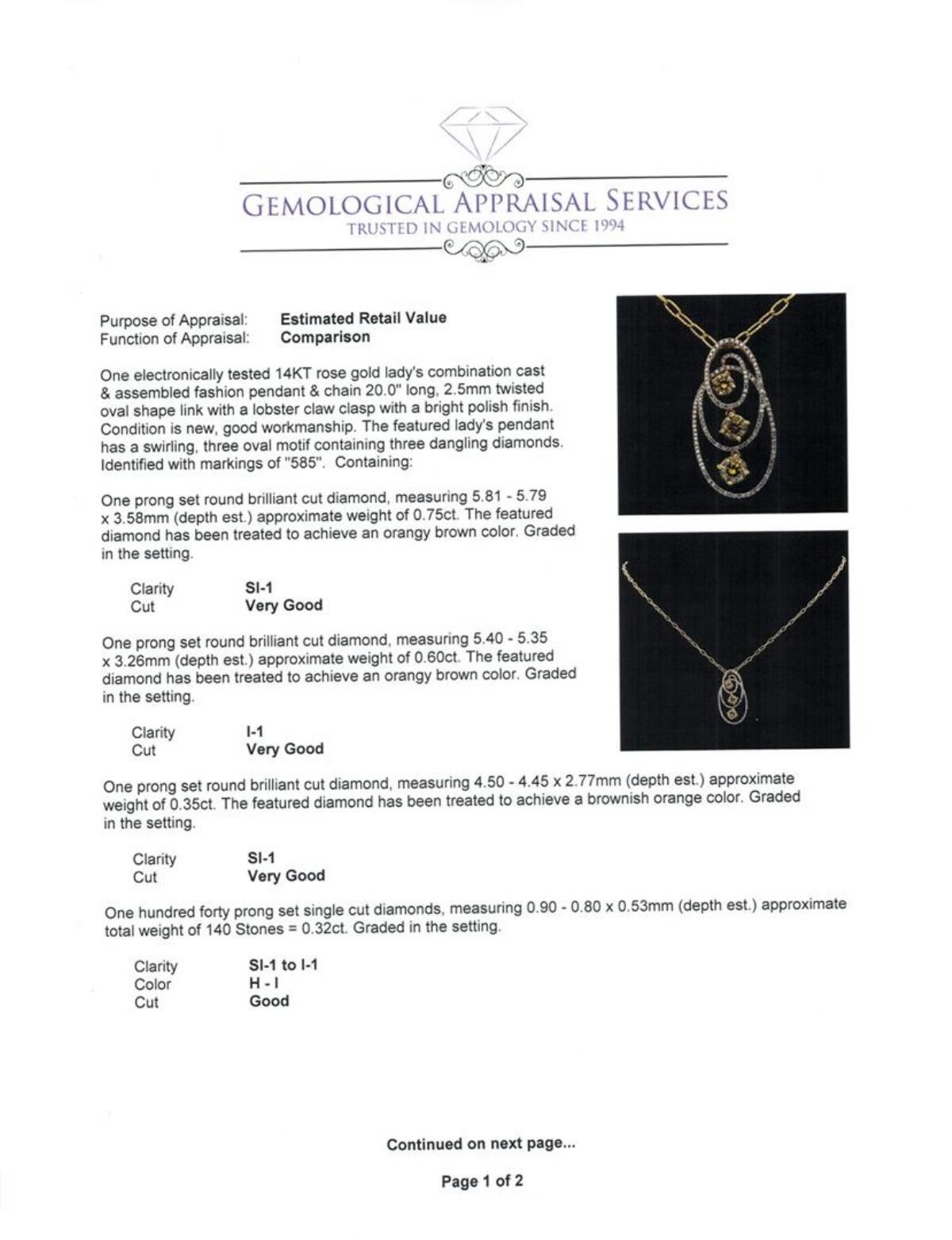 One electronically tested 14KT rose gold lady's combination cast & assembled fashion pendant & chain 20.0' long, 2.5mm twisted oval shape link with a lobster claw clasp with a bright polish finish. The featured lady's pendant has a swirling, three oval motif containing three dangling diamonds. Identified with markings of '585'. Condition is new, good workmanship. Containing: One prong set round brilliant cut diamond, measuring 5.81 - 5.79 x 3.58mm (depth est.) approximate weight of 0.75ct. The featured diamond has been treated to achieve an orangy brown color. Graded in the setting. Clarity SI-1 Cut Very Good One prong set round brilliant cut diamond, measuring 5.40 - 5.35 x 3.26mm (depth est.) approximate weight of 0.60ct. The featured diamond has been treated to achieve an orangy brown color. Graded in the setting. Clarity I-1 Cut Very Good One prong set round brilliant cut diamond, measuring 4.50 - 4.45 x 2.77mm (depth est.) approximate weight of 0.35ct. The featured diamond has been treated to achieve a brownish orange color. Graded in the setting. Clarity SI-1 Cut Very Good One Hundred Forty prong set single cut diamonds, measuring 0.90 - 0.80 x 0.53mm (depth est.) approximate total weight of 140 Stones = 0.32ct. Graded in the setting. Clarity SI-1 to I-1. Color: H - I Cut Good. Total Weight of Diamonds 2.02ct.. Total Weight of Pendant & Chain 9.20gm GAS Appraised.