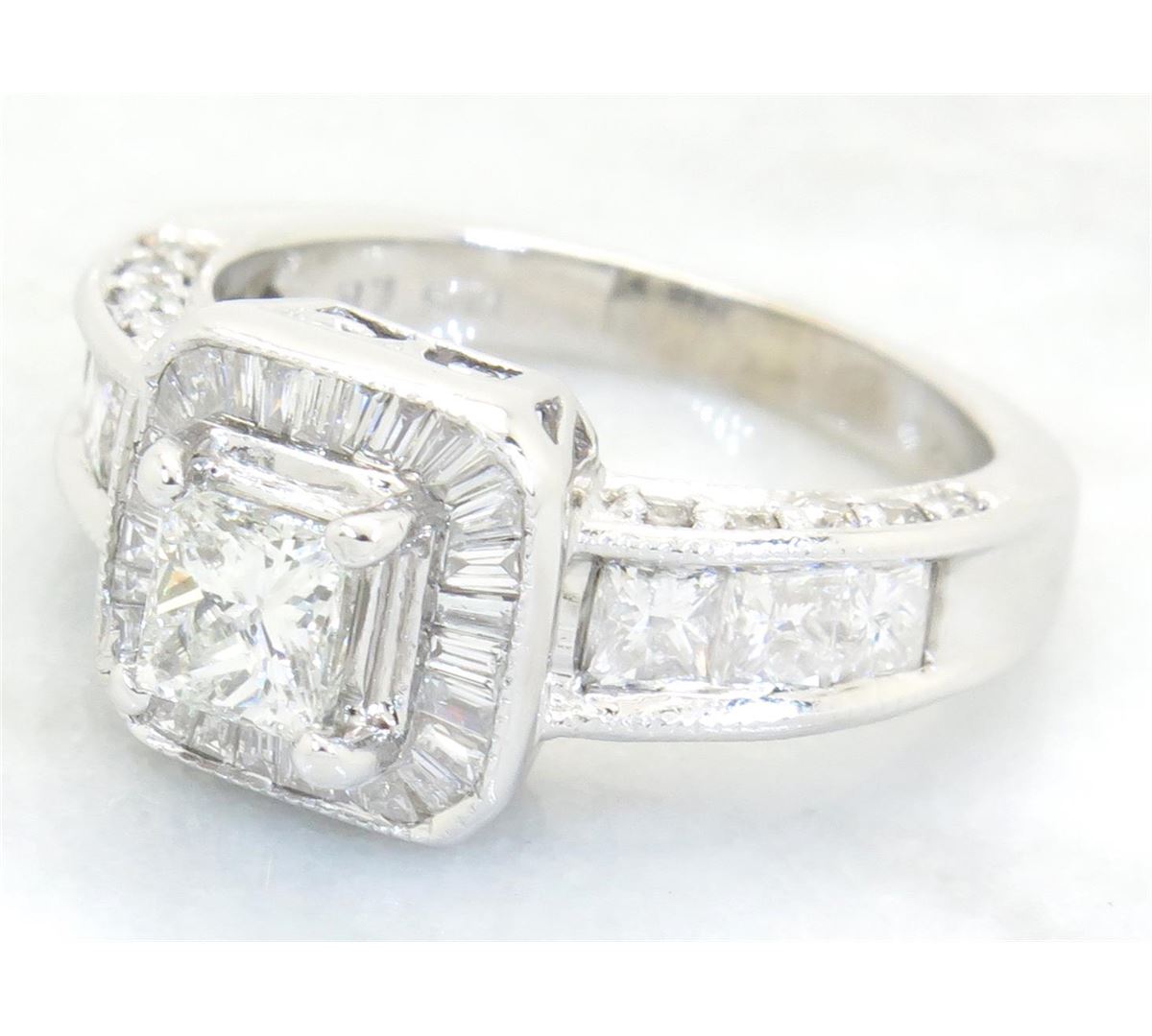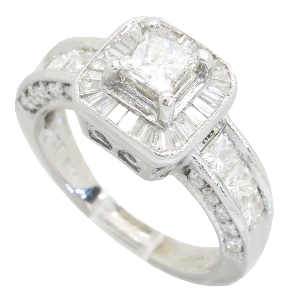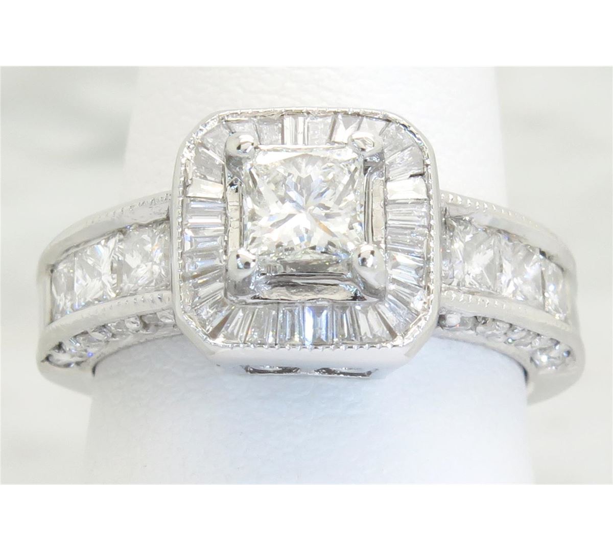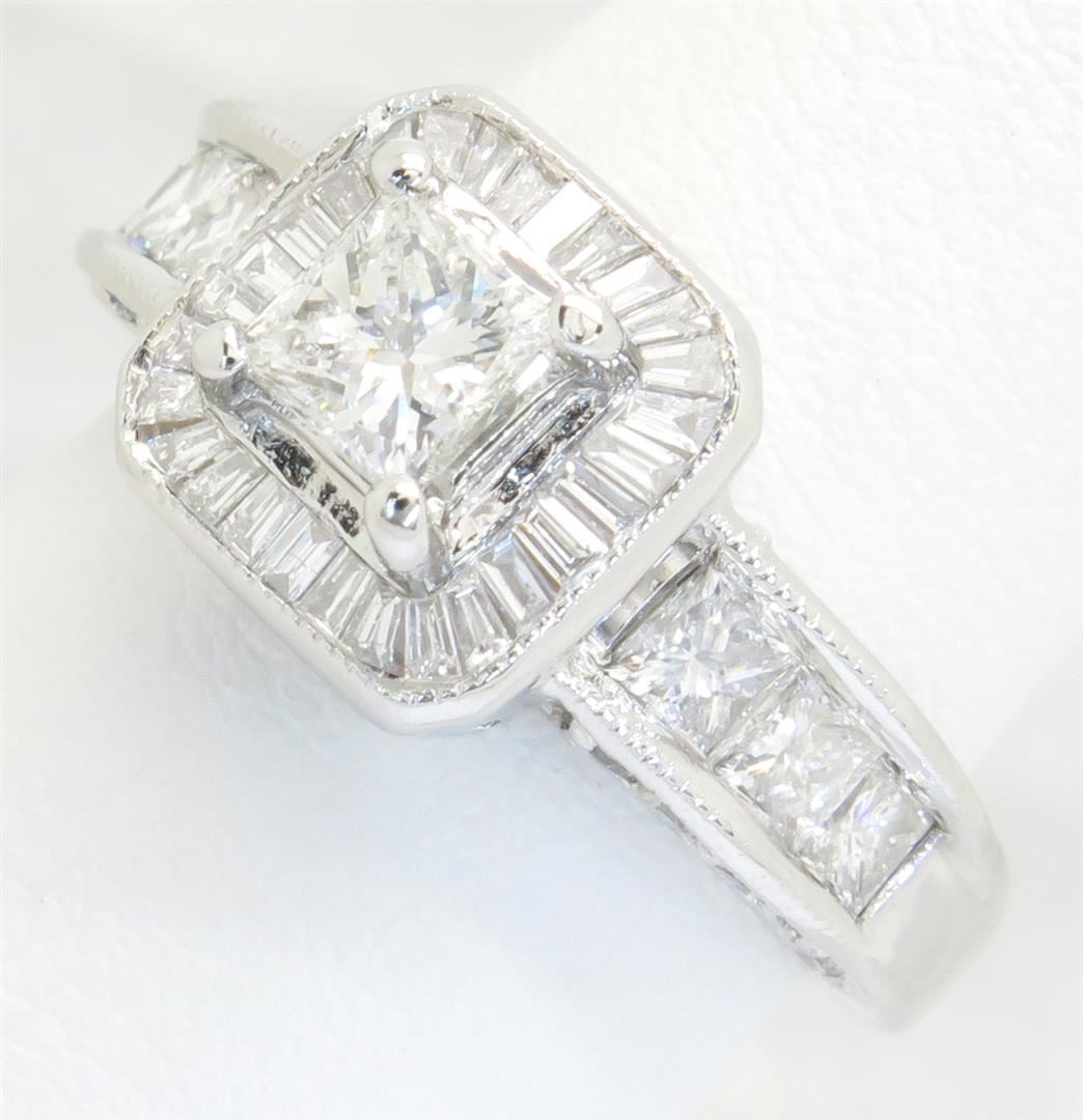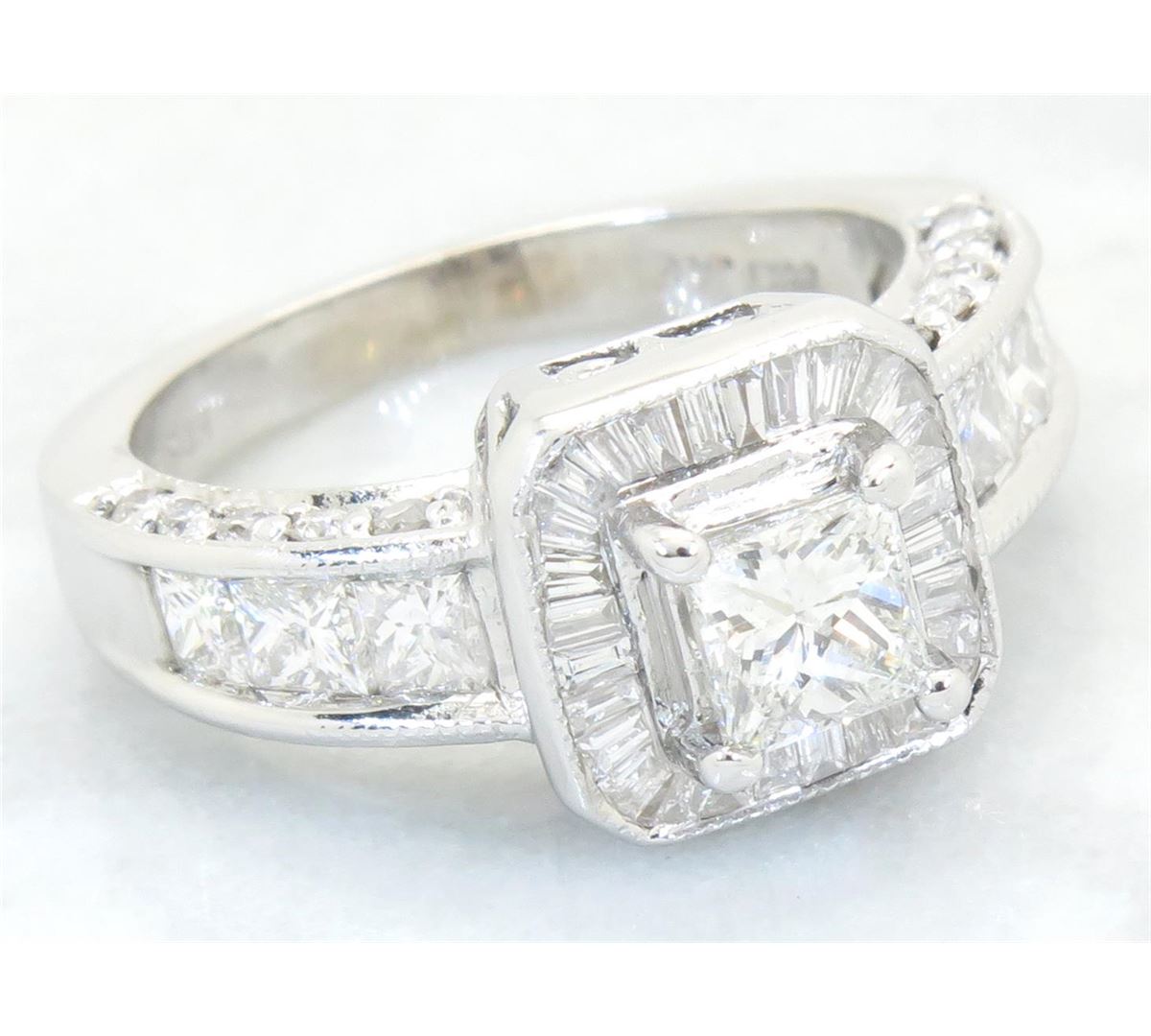 One tested 14K white gold diamond ring. Containing: One Princess Cut Diamond. Approximate size: .50CT, Clarity: SI2, Color: G-H. 28 Baguette Cut Diamonds, 6 Princess Cut Diamonds, 20 Round Brilliant Cut Diamonds. Approximate total diamond weight: 2.02CTW. All diamonds are graded in the mounting unless otherwise stated. Weight of ring: 5.4 grams, Size: 4.75.