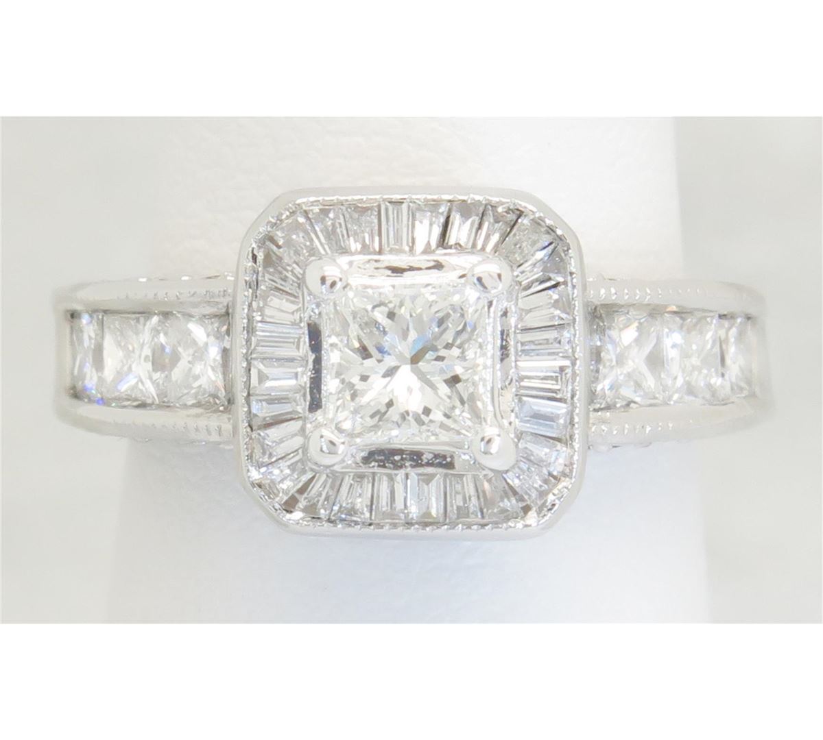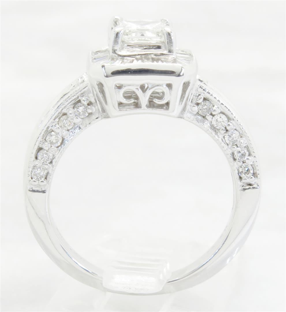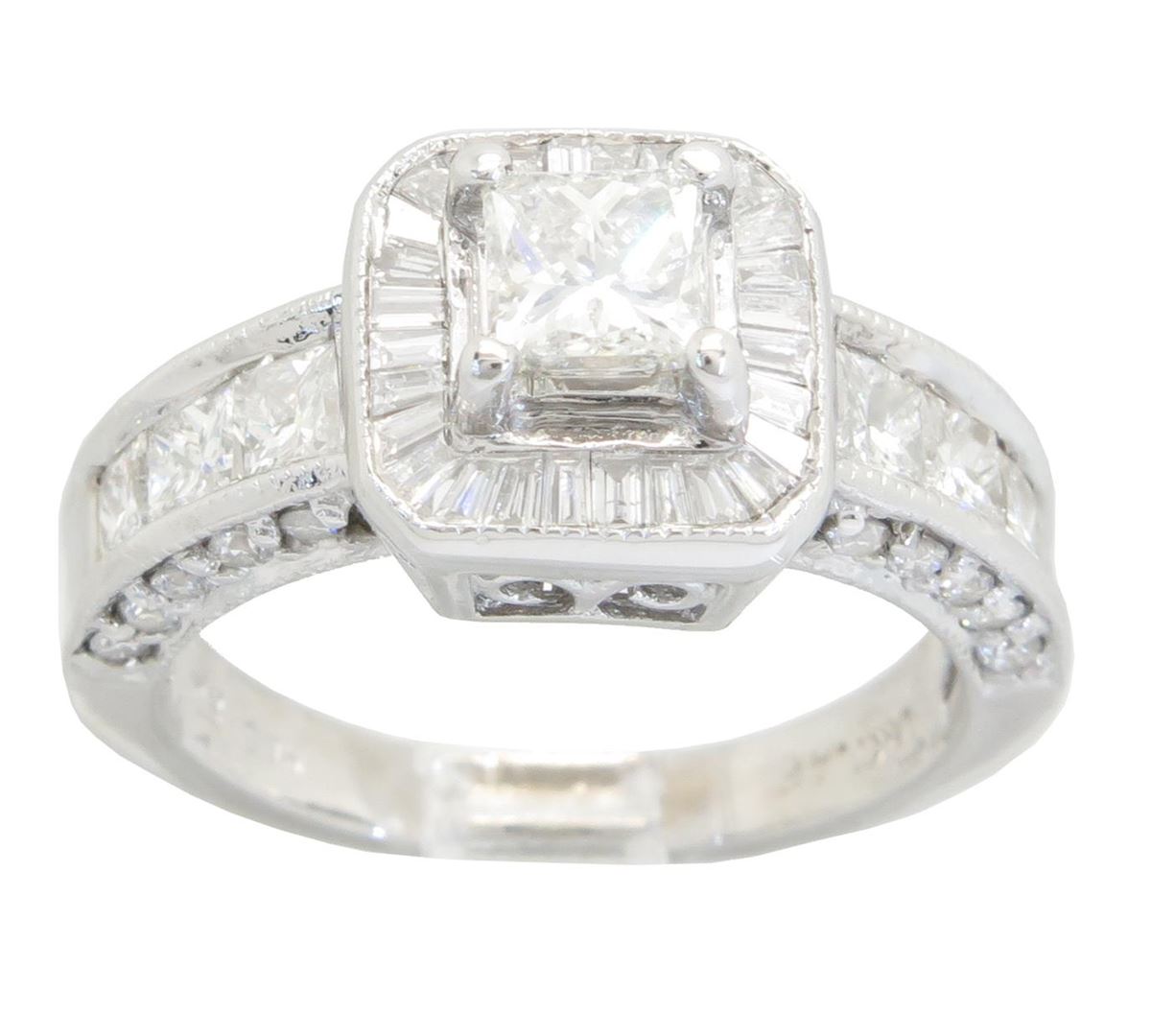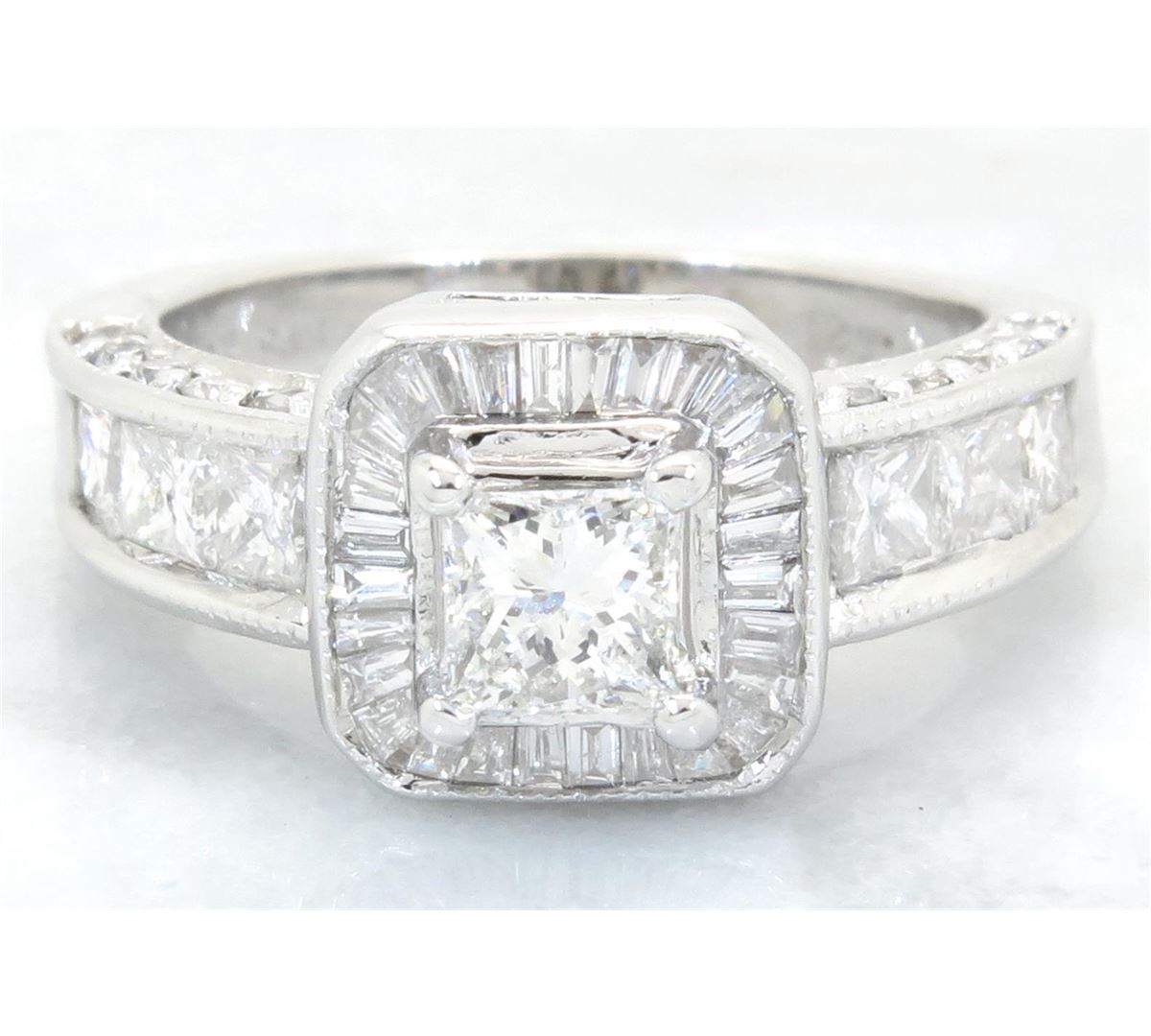 One tested 14K white gold diamond ring. Containing: One Princess Cut Diamond. Approximate size: .50CT, Clarity: SI2, Color: G-H. 28 Baguette Cut Diamonds, 6 Princess Cut Diamonds, 20 Round Brilliant Cut Diamonds. Approximate total diamond weight: 2.02CTW. All diamonds are graded in the mounting unless otherwise stated. Weight of ring: 5.4 grams, Size: 4.75.