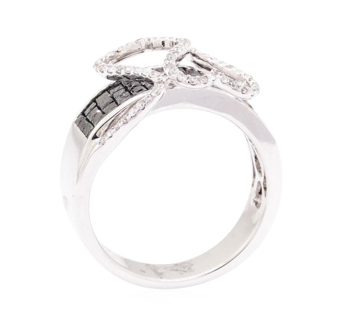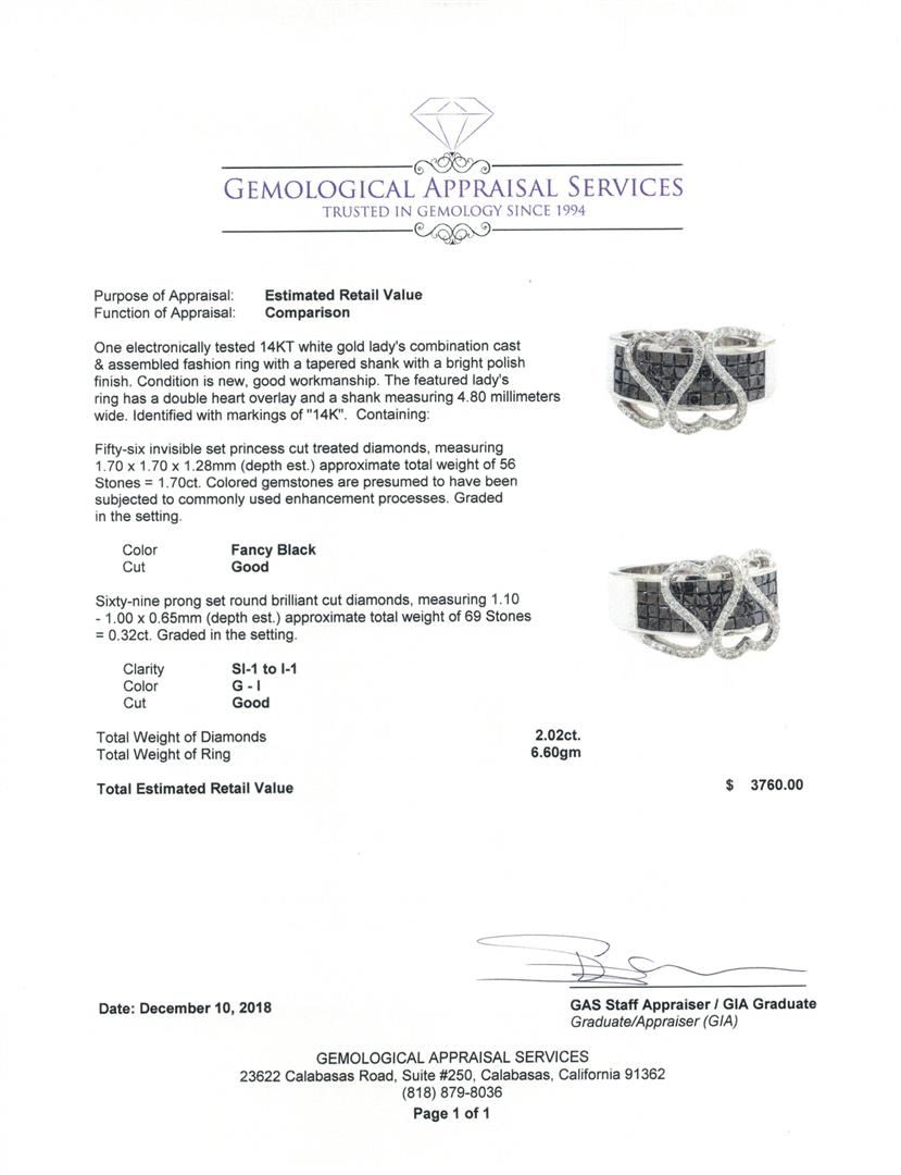 One electronically tested 14KT white gold lady's combination cast & assembled fashion ring with a tapered shank with a bright polish finish. The featured lady's ring has a double heart overlay and a shank measuring 4.80 millimeters wide. Identified with markings of '14K'. Condition is new, good workmanship. Containing: Fifty-Six invisible set princess cut treated diamonds, measuring 1.70 x 1.70 x 1.28mm (depth est.) approximate total weight of 56 Stones = 1.70ct. Colored gemstones are presumed to have been subjected to commonly used enhancement processes. Graded in the setting. Color Fancy Black Cut Good Sixty-Nine prong set round brilliant cut diamonds, measuring 1.10 - 1.00 x 0.65mm (depth est.) approximate total weight of 69 Stones = 0.32ct. Graded in the setting. Color G - I Clarity SI-1 to I-1 Cut Good. Total Weight of Diamonds 2.02ct.. Total Weight of Ring 6.60gm GAS Appraised at $3760.00. GAS Appraised.