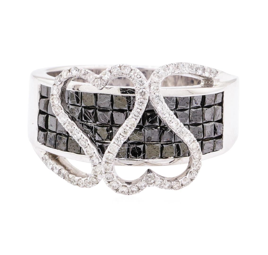 One electronically tested 14KT white gold lady's combination cast & assembled fashion ring with a tapered shank with a bright polish finish. The featured lady's ring has a double heart overlay and a shank measuring 4.80 millimeters wide. Identified with markings of '14K'. Condition is new, good workmanship. Containing: Fifty-Six invisible set princess cut treated diamonds, measuring 1.70 x 1.70 x 1.28mm (depth est.) approximate total weight of 56 Stones = 1.70ct. Colored gemstones are presumed to have been subjected to commonly used enhancement processes. Graded in the setting. Color Fancy Black Cut Good Sixty-Nine prong set round brilliant cut diamonds, measuring 1.10 - 1.00 x 0.65mm (depth est.) approximate total weight of 69 Stones = 0.32ct. Graded in the setting. Color G - I Clarity SI-1 to I-1 Cut Good. Total Weight of Diamonds 2.02ct.. Total Weight of Ring 6.60gm GAS Appraised at $3760.00. GAS Appraised.