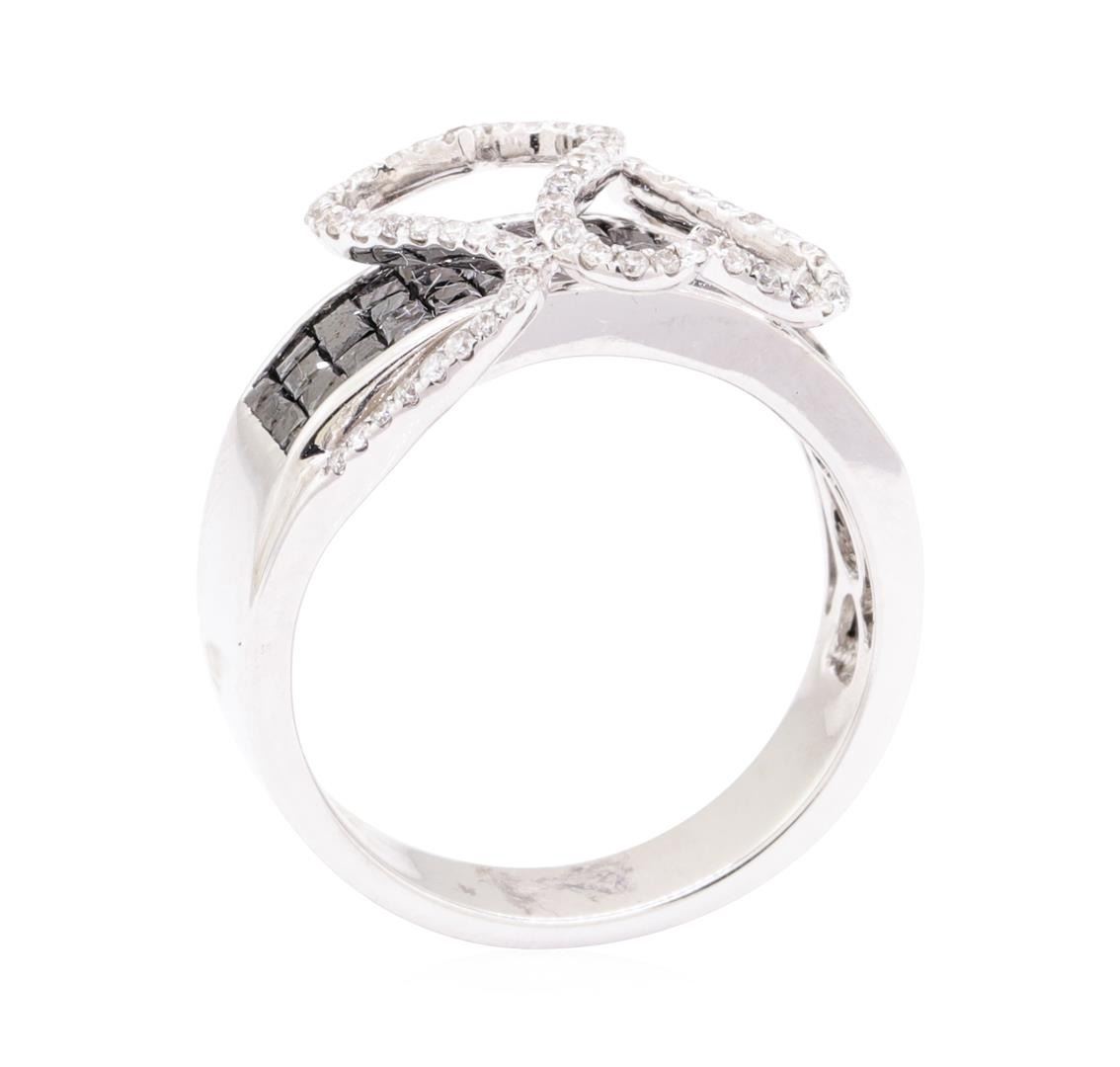 One electronically tested 14KT white gold lady's combination cast & assembled fashion ring with a tapered shank with a bright polish finish. The featured lady's ring has a double heart overlay and a shank measuring 4.80 millimeters wide. Identified with markings of '14K'. Condition is new, good workmanship. Containing: Fifty-Six invisible set princess cut treated diamonds, measuring 1.70 x 1.70 x 1.28mm (depth est.) approximate total weight of 56 Stones = 1.70 ct. Colored gemstones are presumed to have been subjected to commonly used enhancement processes. Graded in the setting. Color Fancy Black Cut Good Sixty-Nine prong set round brilliant cut diamonds, measuring 1.10 - 1.00 x 0.65mm (depth est.) approximate total weight of 69 Stones = 0.32ct. Graded in the setting. Color G - I Clarity SI-1 to I-1 Cut Good. Total Weight of Diamonds 2.02ct.. Total Weight of Ring 6.60gm GAS Appraised at $3760.00. GAS Appraised.
