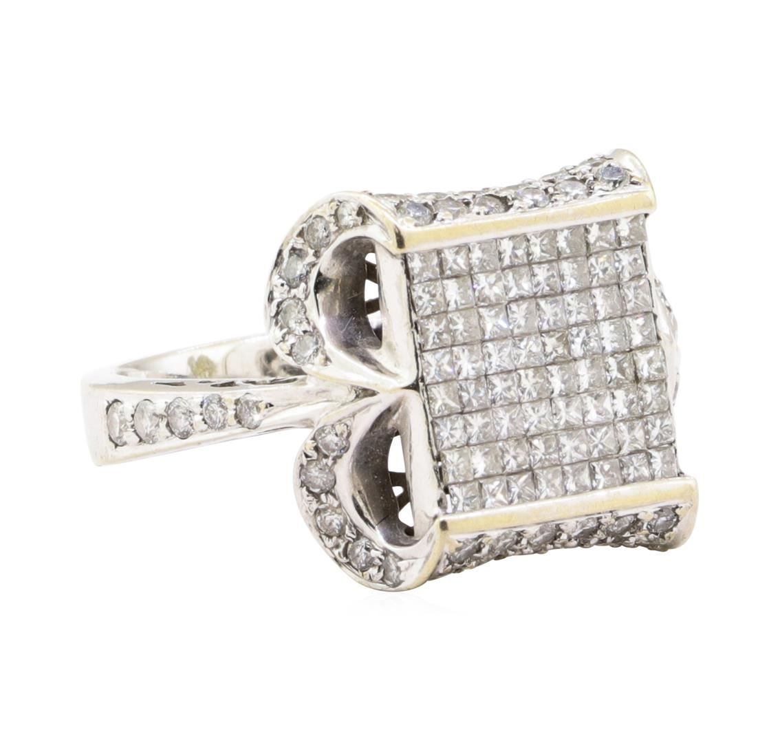One electronically tested 18KT white gold lady's cast fashion ring with a square top with scalloped edges with a bright polish finish. The featured lady's ring has a shank measuring 4.00 millimeters wide. Identified with markings of '18K'. Condition is new, good workmanship. Containing: Sixty-Four invisible set princess cut diamonds, measuring 1.30 x 1.30 x 0.98mm (depth est.) approximate total weight of 64 Stones = 0.90 ct. Graded in the setting. Color H - I Clarity SI-1 to I-1 Cut Good Sixty-Six prong set round brilliant cut diamonds, measuring 1.80 - 1.50 x 1.02mm (depth est.) approximate total weight of 66 Stones = 1.12ct. Graded in the setting. Color H - I Clarity SI-1 to I-1 Cut Good. Total Weight of Diamonds 2.02ct.. Total Weight of Ring 9.00gm GAS Appraised at $5630.00. GAS Appraised.