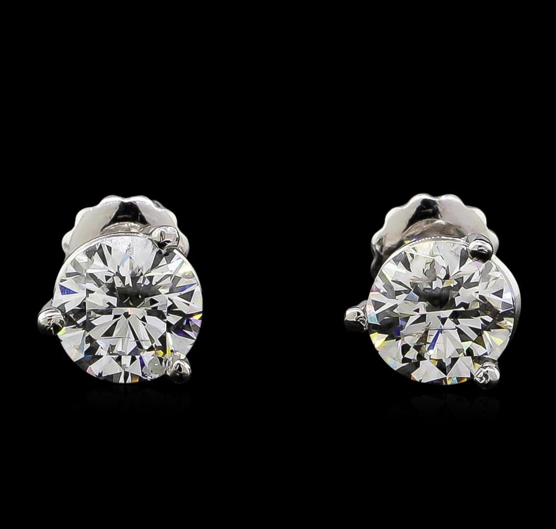 One pair electronically tested platinum cast & assembled diamond solitaire earrings with screw backs. Bright polish finish. Condition is new, good workmanship. Containing: One prong set round brilliant cut diamond, measuring 6.40 - 6.35 x 3.94mm (depth est.) approximate weight of 1.00ct with a faint blue fluorescence. Graded in the setting. Clarity: I-1. Color: G. Depth 61.8%. Table 58.6%. One prong set round brilliant cut diamond, measuring 6.30 - 6.25 x 3.97mm (depth est.), 4.00.%. GTCF approximate weight of 1.02ct. Graded in the setting. Clarity: SI-2. Color: H. Depth 63.2%. Table 58.9%. Total Weight of Diamonds 2.02ct. Total Weight of Earrings 2.71gm. AIG Appraised at $20,185.00.