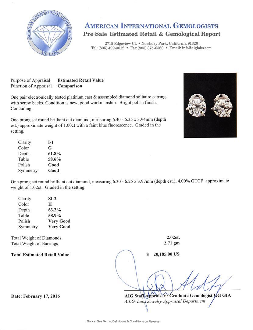 One pair electronically tested platinum cast & assembled diamond solitaire earrings with screw backs. Bright polish finish. Condition is new, good workmanship. Containing: One prong set round brilliant cut diamond, measuring 6.40 - 6.35 x 3.94mm (depth est.) approximate weight of 1.00ct with a faint blue fluorescence. Graded in the setting. Clarity: I-1. Color: G. Depth 61.8%. Table 58.6%. One prong set round brilliant cut diamond, measuring 6.30 - 6.25 x 3.97mm (depth est.), 4.00.%. GTCF approximate weight of 1.02ct. Graded in the setting. Clarity: SI-2. Color: H. Depth 63.2%. Table 58.9%. Total Weight of Diamonds 2.02ct. Total Weight of Earrings 2.71gm. AIG Appraised at $20,185.00.