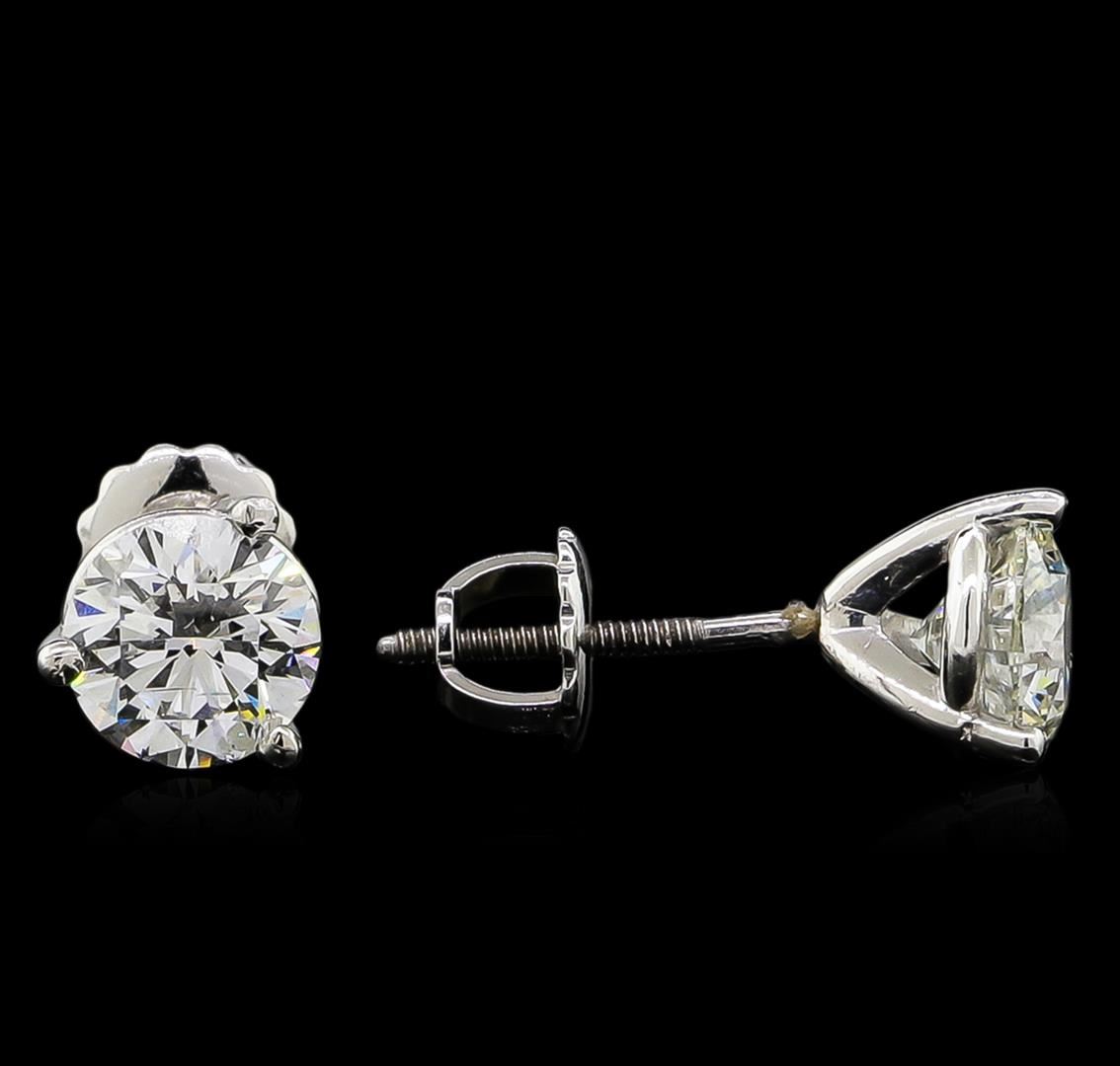 One pair electronically tested platinum cast & assembled diamond solitaire earrings with screw backs. Bright polish finish. Condition is new, good workmanship. Containing: One prong set round brilliant cut diamond, measuring 6.40 - 6.35 x 3.94mm (depth est.) approximate weight of 1.00ct with a faint blue fluorescence. Graded in the setting. Clarity: I-1. Color: G. Depth 61.8%. Table 58.6%. One prong set round brilliant cut diamond, measuring 6.30 - 6.25 x 3.97mm (depth est.), 4.00.%. GTCF approximate weight of 1.02ct. Graded in the setting. Clarity: SI-2. Color: H. Depth 63.2%. Table 58.9%. Total Weight of Diamonds 2.02ct. Total Weight of Earrings 2.71gm. AIG Appraised at $20,185.00.