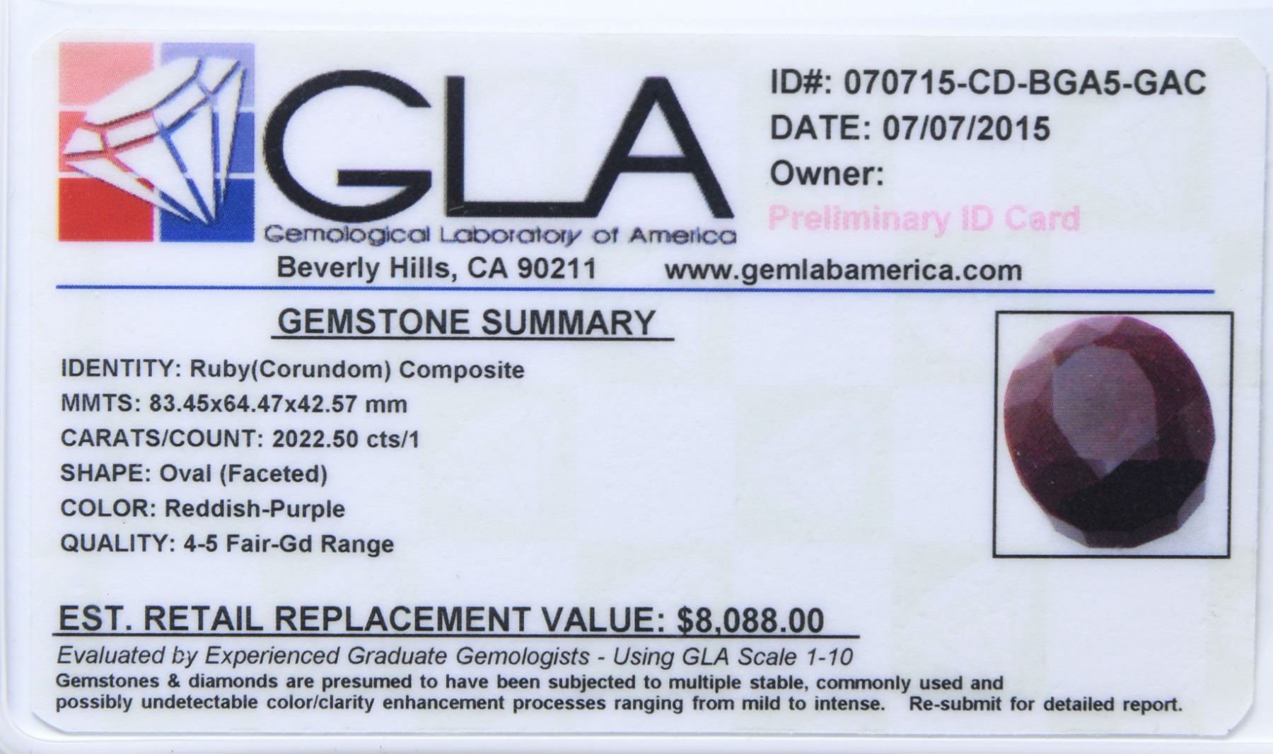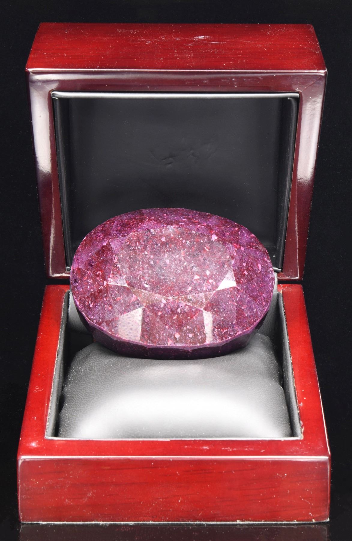 GEMSTONE. This oval faceted ruby is comprised of corundum; rock forming mineral which is naturally transparent. It is a crystalline form of aluminum oxide which typically has traces of iron, titanium, vanadium, and chromium. Stone measures 83.45 x 64.47 x 42.57mm in fair-good range and comes in a red hinged box for presentation. UNATTACHED ACCESSORIES: GLA (Gemological Laboratory of America) of Beverly Hills, CA summary card identifying this stone, dated 07/07/2015. Red glossy laminated wood presentation box w/ black exterior box. CONDITION: very good to fine with miniscule roughness on some faceted edges. (02-24249/JK). NON-GUN. $2,000-3,000.