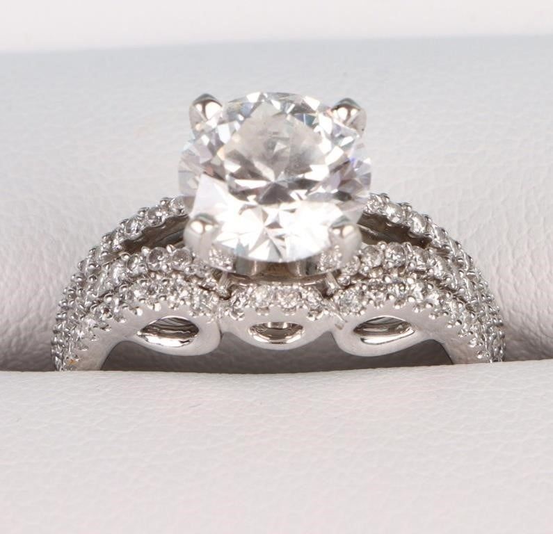 2.03 ct. Solitaire Brilliant Round Center lab diamond E color with VS1 clarity and excellent cut from Fana IGI Certification #: LG601327302 laser inscribed. Double row pave diamond shank leading up to the center stone. 14k white gold band.