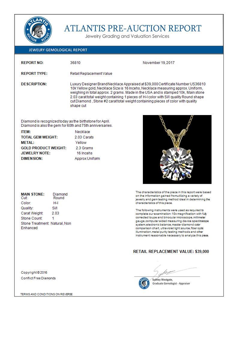 REF-585X2T -36810 ---- 2.03 CTW Certified H-SI/I Quality Diamond Solitaire Necklace 10K Yellow Gold ---- Luxury Designer Brand Necklace Appraised at $39,000 Certificate Number US36810 10k Yellow gold, Necklace Size is 16 Incehs, Necklace measuring approx. Uniform, weighing in total approx. 2 grams. Made in the USA and is stamped 10k, Main stone 2.03 carat total weight containing 1 pieces of H-I color with SI/I quality Round shape cut Diamond , Stone #2 carat total weight containing pieces of color with quality shape cut
