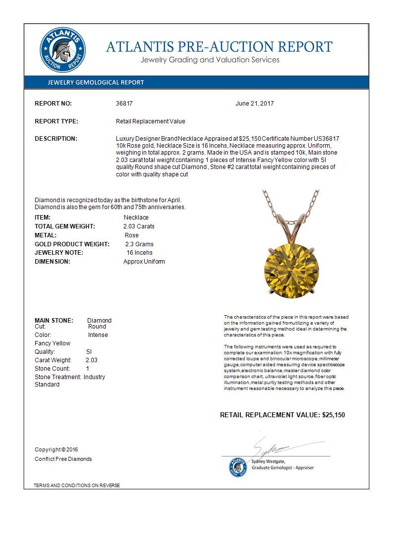 2.03 CTW Certified Intense Yellow SI Diamond Solitaire Necklace 10K Rose Gold ---- Luxury Designer Brand Necklace Appraised Retail Price at $25,150 ---- SKU Number US36817 10k Rose gold Necklace Size is 16 Incehs, Necklace measuring approx. Uniform, weighing in total approx. 2 grams. Made in the USA and is stamped 10k, Main stone 2.03 carat total weight containing 1 pieces of Intense Fancy Yellow color with SI quality Round shape cut Diamond , Stone #2 carat total weight containing pieces of color with quality shape cut