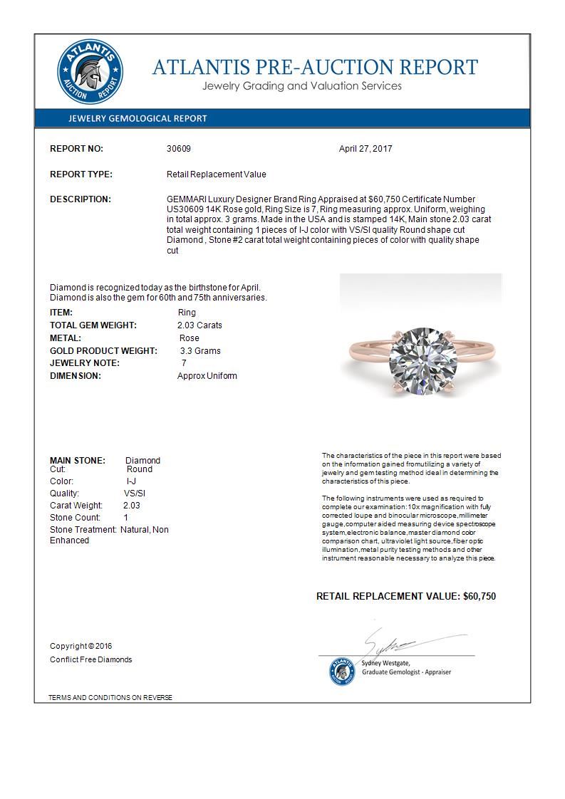 2.03 CTW Certified VS/SI Diamond Engagement Ring 14K Rose Gold ---- Luxury Designer Brand Ring Appraised Retail Price at $60,750 ---- SKU Number US30609 14K Rose gold Ring Size is 7, Ring measuring approx. Uniform, weighing in total approx. 3 grams. Made in the USA and is stamped 14K, Main stone 2.03 carat total weight containing 1 pieces of I-J color with VS/SI quality Round shape cut Diamond , Stone #2 carat total weight containing pieces of color with quality shape cut
