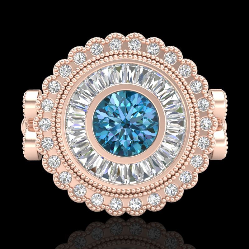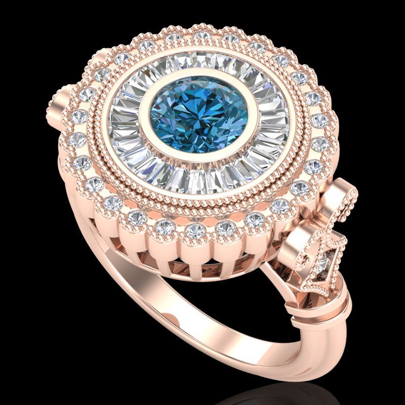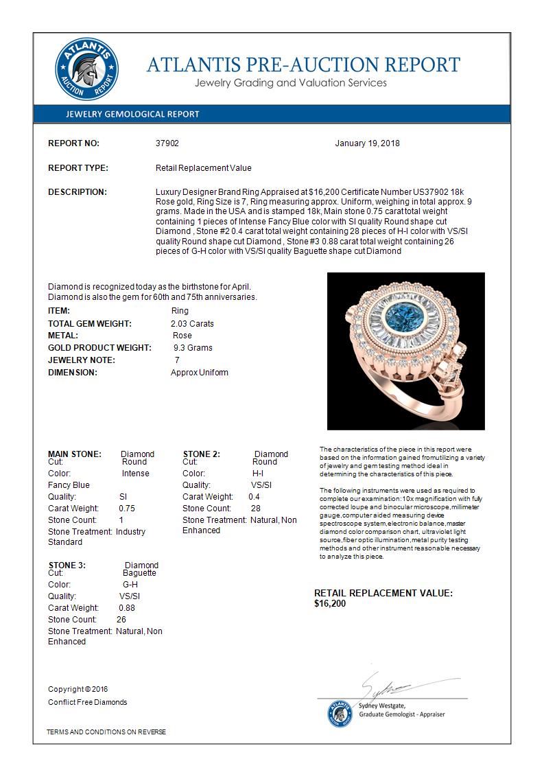 REF-245M5H -37902 ---- 2.03 CTW Fancy Intense Blue Diamond Solitaire Art Deco Ring 18K Rose Gold ---- Luxury Designer Brand Ring Appraised at $16,200 Certificate Number US37902 18k Rose gold, Ring Size is 7, Ring measuring approx. Uniform, weighing in total approx. 9 grams. Made in the USA and is stamped 18k, Main stone 0.75 carat total weight containing 1 pieces of Intense Fancy Blue color with SI quality Round shape cut Diamond , Stone #2 0.4 carat total weight containing 28 pieces of H-I color with VS/SI quality Round shape cut Diamond , Stone #3 0.88 carat total weight containing 26 pieces of G-H color with VS/SI quality Baguette shape cut Diamond