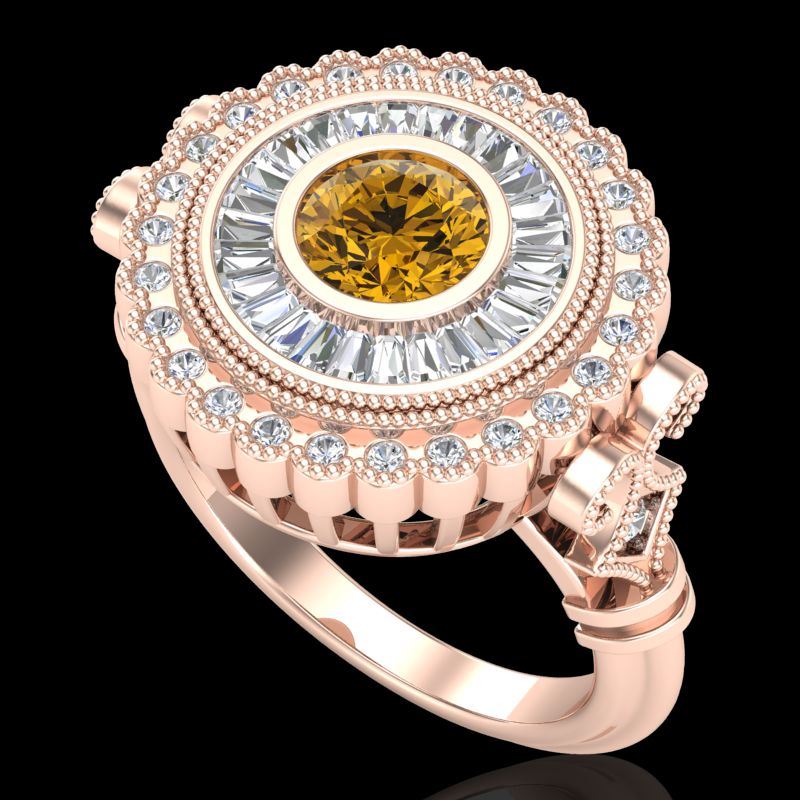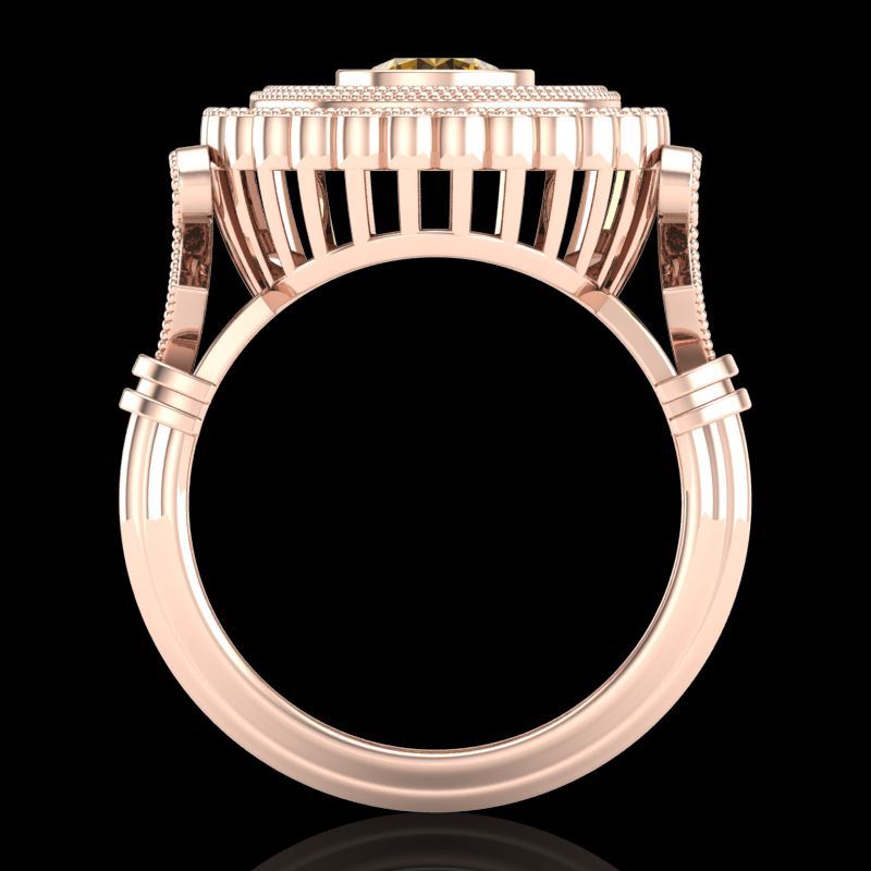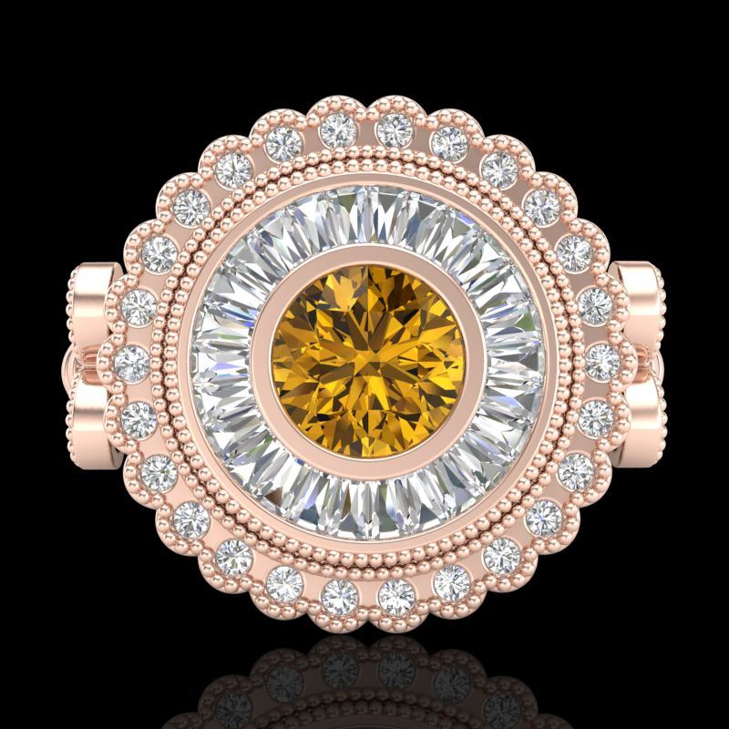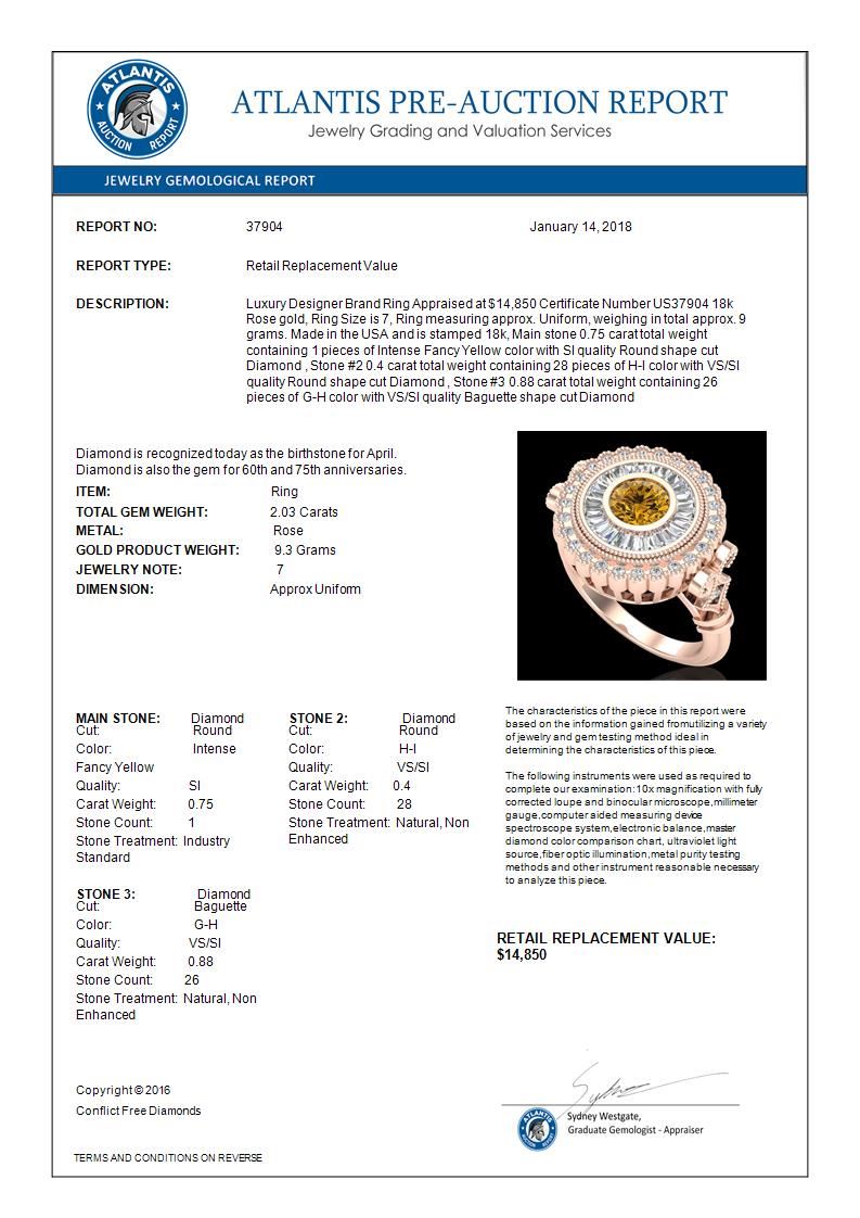 REF-245K5W -37904 ---- 2.03 CTW Intense Fancy Yellow Diamond Engagement Art Deco Ring 18K Rose Gold ---- Luxury Designer Brand Ring Appraised at $14,850 Certificate Number US37904 18k Rose gold, Ring Size is 7, Ring measuring approx. Uniform, weighing in total approx. 9 grams. Made in the USA and is stamped 18k, Main stone 0.75 carat total weight containing 1 pieces of Intense Fancy Yellow color with SI quality Round shape cut Diamond , Stone #2 0.4 carat total weight containing 28 pieces of H-I color with VS/SI quality Round shape cut Diamond , Stone #3 0.88 carat total weight containing 26 pieces of G-H color with VS/SI quality Baguette shape cut Diamond